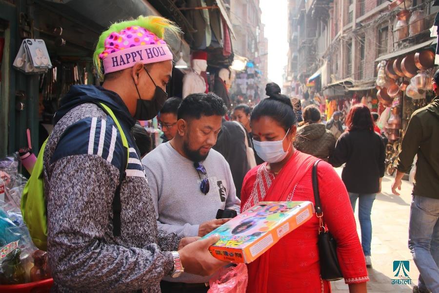 रङहरूको पर्व होली नजिकिएसँगै रङ, टि–सर्ट र पिचकारीको व्यापार बढेको छ। विशेषगरी बालबालिका र किशोरकिशोरीहरूको बढी लगाव हुने यो पर्वका लागि उनीहरूले रङ, टि–सर्ट, पिचकारीलगायतका सामग्री खरिद गर्ने गर्छन्। होलीको पूर्वसन्ध्यामा काठमाडौँको असन, इन्द्रचोक लगायतका स्थानमा होलीका लागि आवश्यक सामान किन्नेहरूको भीड तस्वीरमा:
