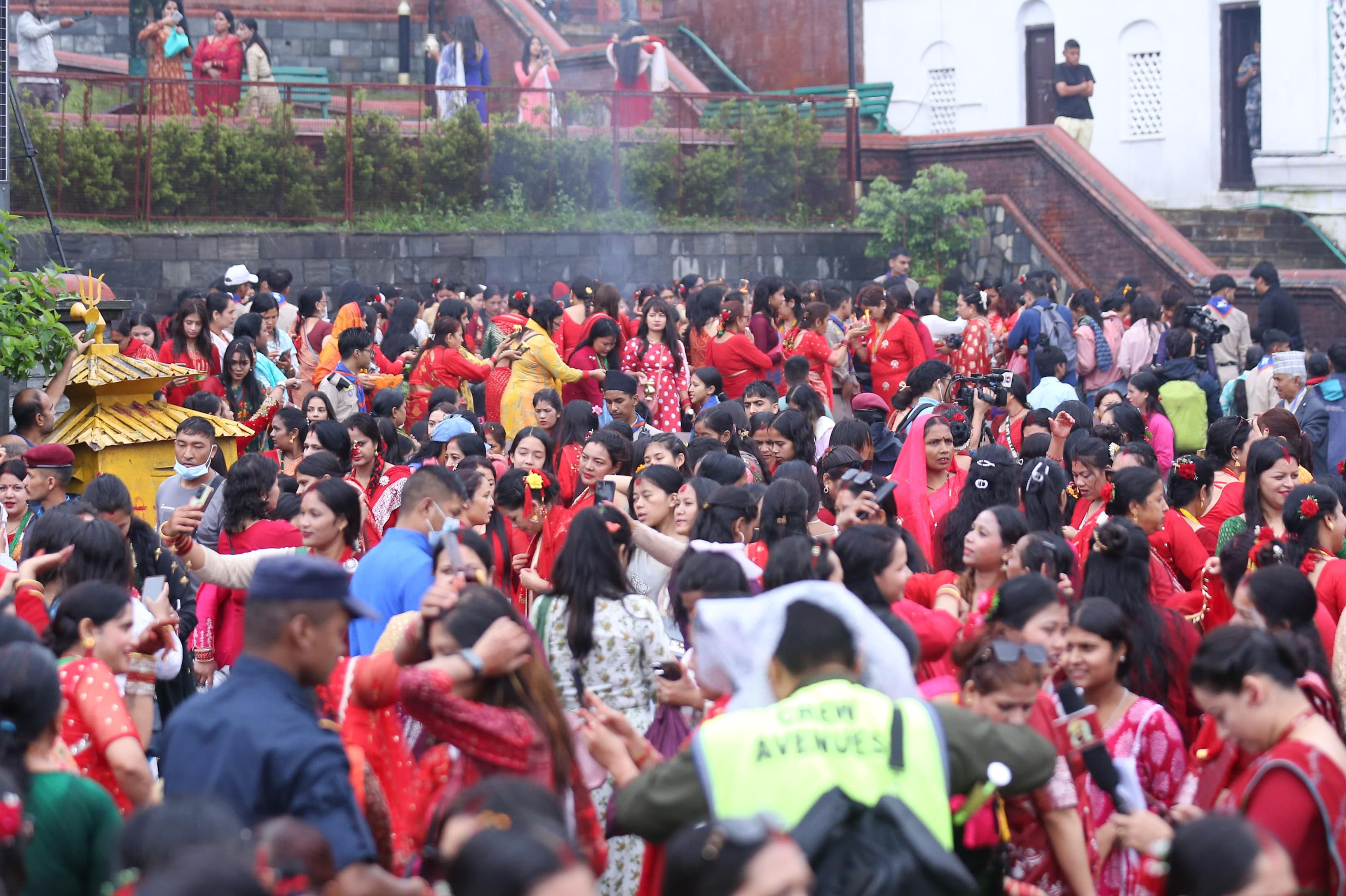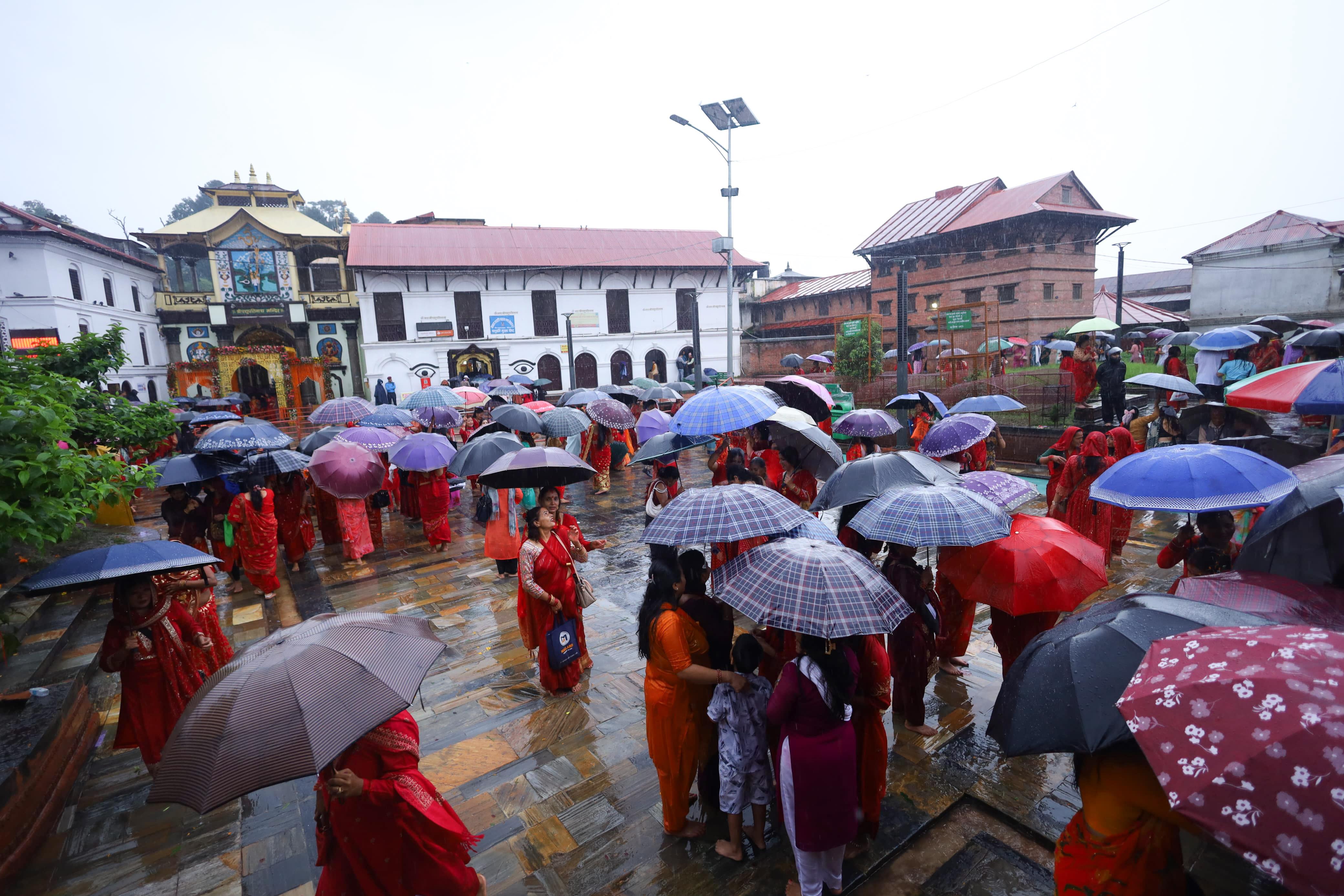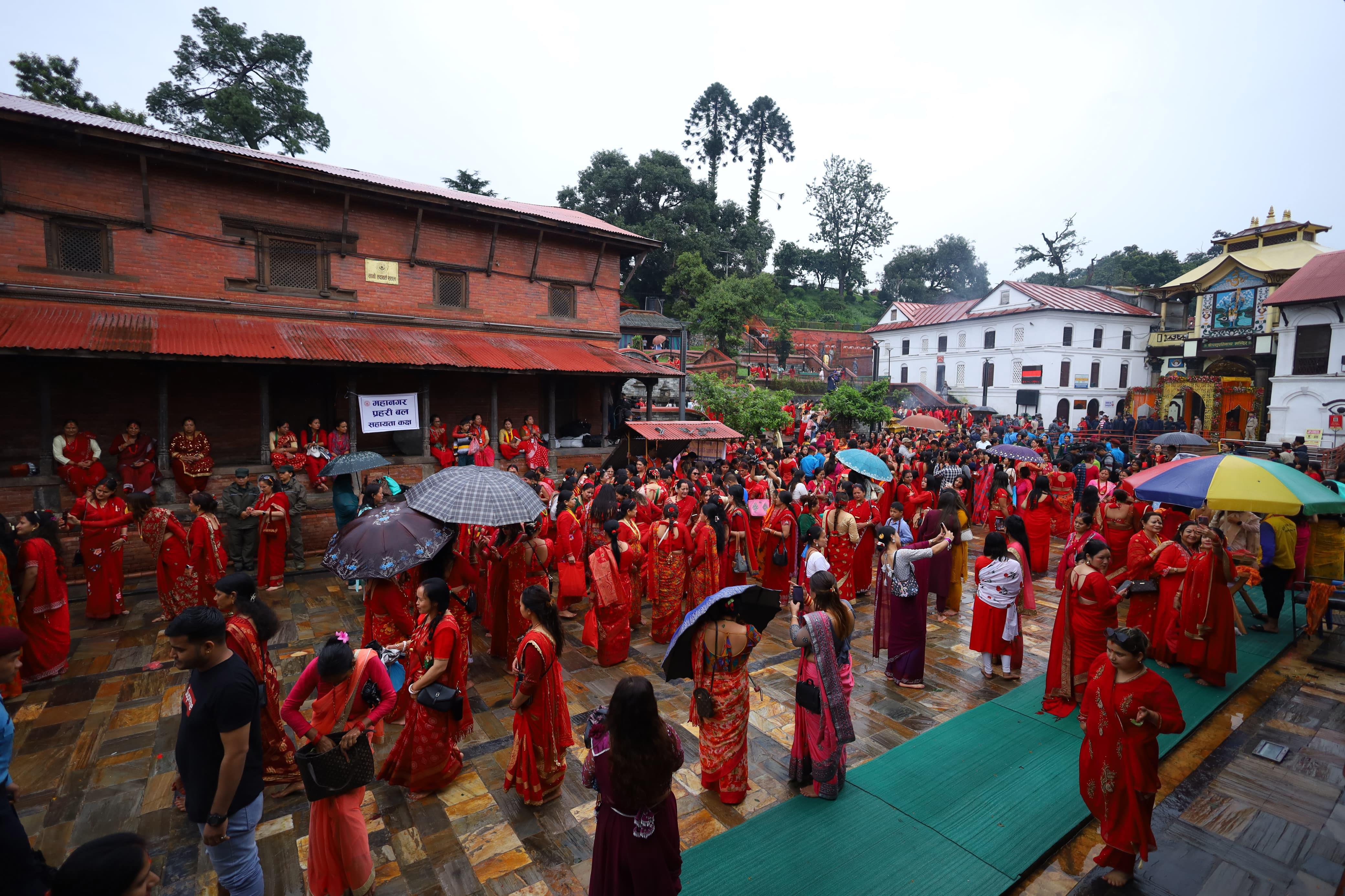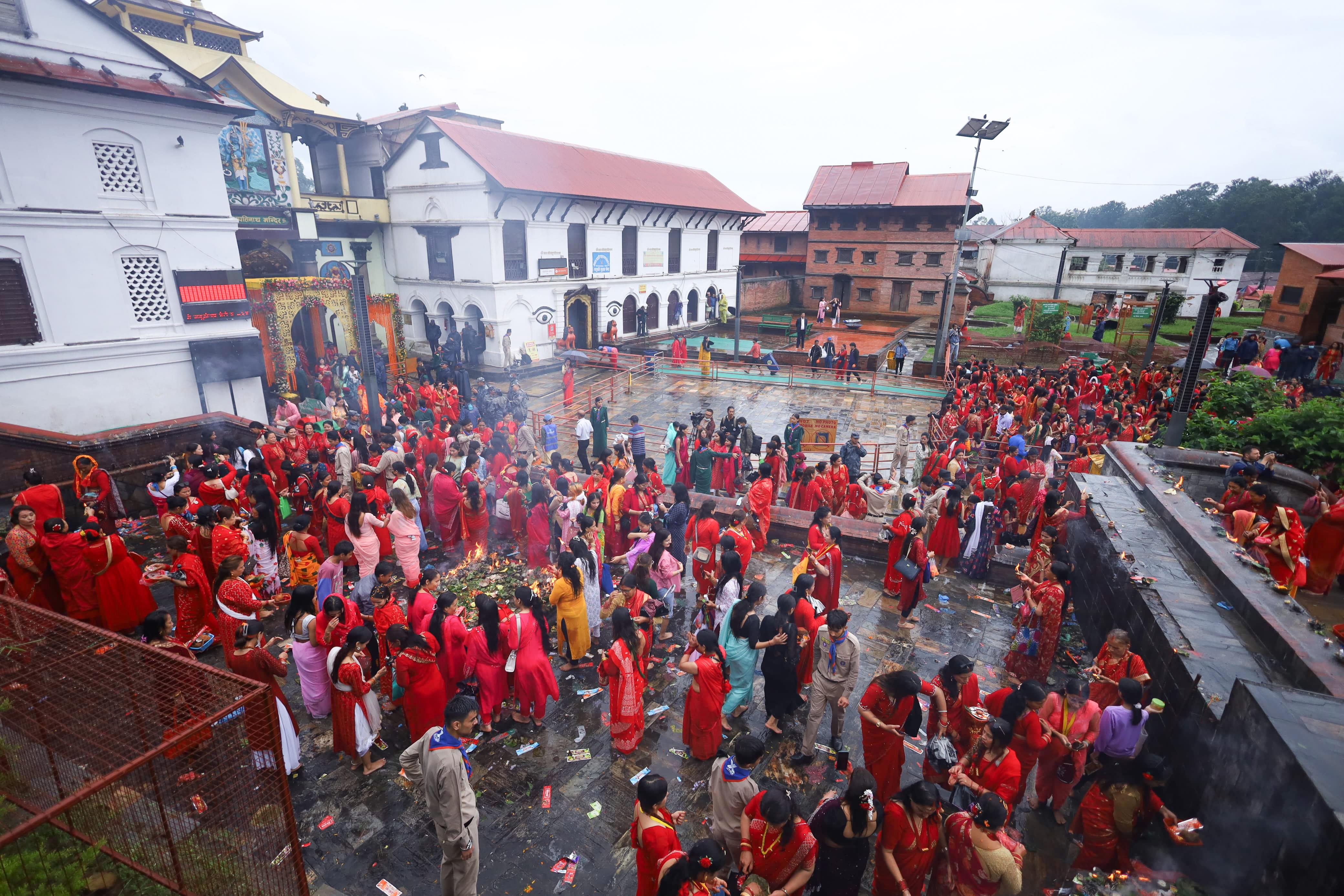 हिन्दू महिलाहरूको महान् चाड हरितालिका तिजको अवसरमा शुक्रबार बिहानैदेखि पशुपतिनाथ मन्दिरमा पूजाआजा गर्न श्रद्धालुको भीड लागेको छ। यस पर्वमा महिलाहरू परिवारमा सुख, शान्ति र कल्याणको कामनासहित व्रत बस्ने गरेका छन्। तस्वीर: नेपाल फोटो लाइब्रेरी।