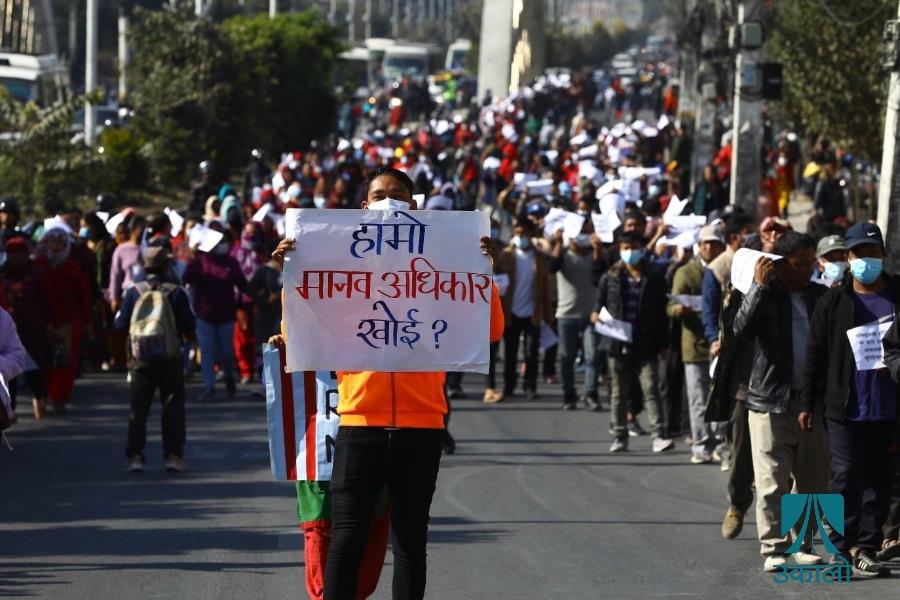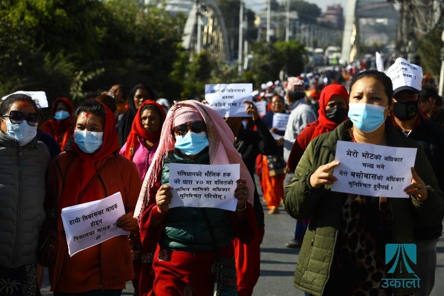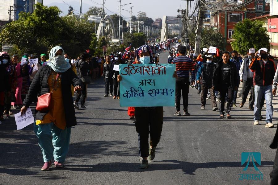 काठमाडौँ– काठमाडौँ थापाथलीस्थित बागमती किनारामा बसेका सुकुमबासीहरूले विभिन्न माग राखी माइतीघर मण्डलमा भेला भई र्यालीसहित नयाँ बानेश्वरमा पुगी धर्ना दिएका छन्। संयुक्त राष्ट्रिय सुकुमबासी मोर्चाको आह्वानमा प्रदर्शन गरिएको हो। काठमाडौँ महानगरपालिकाको भूमिहीन, सुकुमबासीमाथि दमनकारी शैलीले आफूहरूमा त्रास फैलिएको उनीहरूको भनाइ छ। उनीहरूले सुकुमबासी व्यवस्थापनको सवालमा आपसी समझदारी, वार्ता र छलफलको माध्यमबाट सदाका लागि समाधान खोज्न अनुरोध गरेका छन्। त्यस्तै, भूमि अभियन्तामाथिको जाहेरी फिर्ता लिन पनि उनीहरूले माग गरेका छन्। उनीहरूले \'हाम्रो मानवअधिकार खोइ?\', \'उठीबासको त्रास कहिलेसम्म?\', \'लालपुर्जा विहीनताको अवस्था कहिलेसम्म?\' लगायतका नारा लेखिएका प्लेकार्ड बोकेर आन्दोलित बनेका थिए।