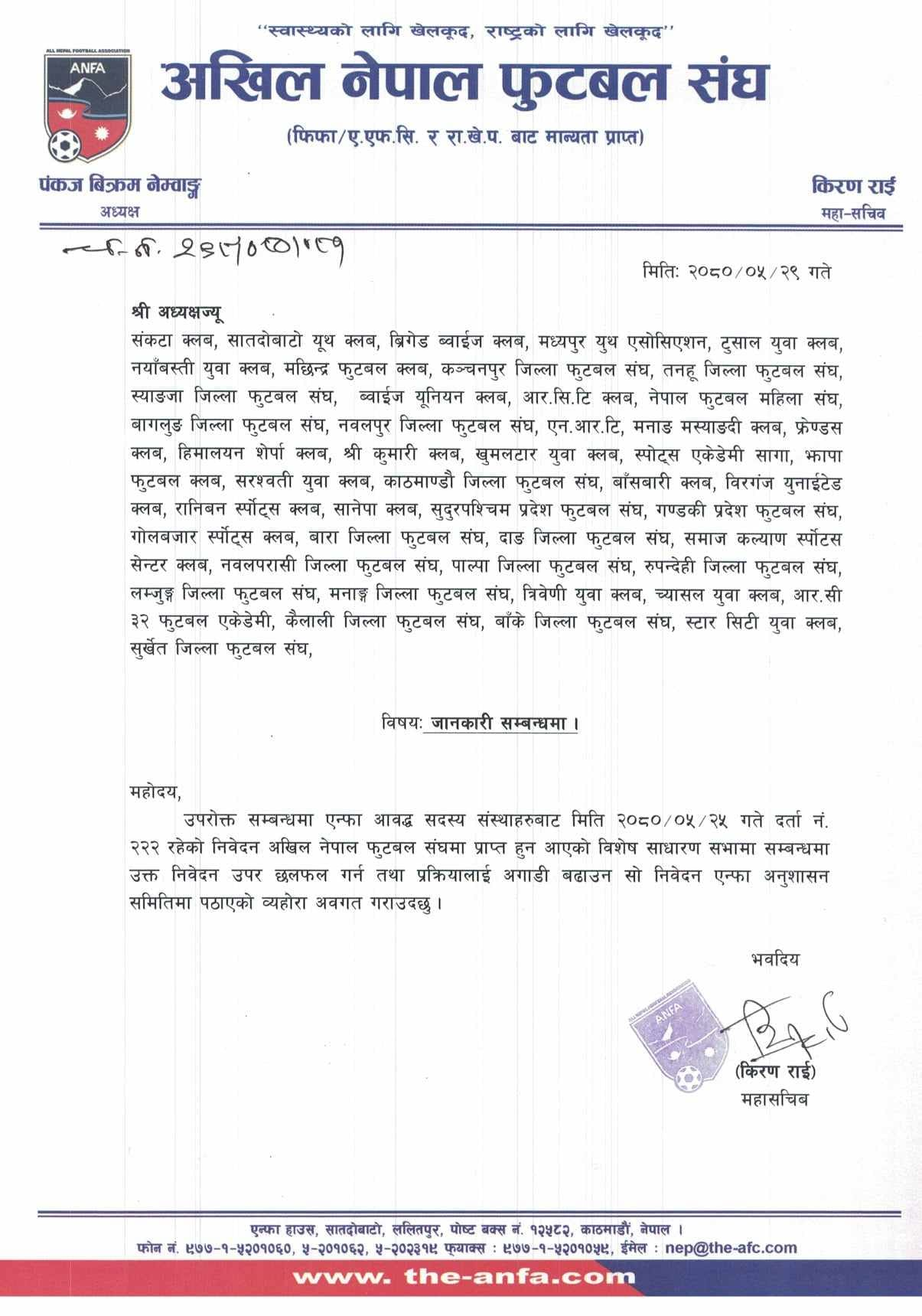 बहुमत सदस्यले अध्यक्ष पंकजविक्रम नेम्वाङ र आफूविरुद्ध दर्ता गरेको बर्खास्तीको पत्र वैधानिक नभएकाे भन्दै महासचिव किरण राईले अखिल फुटबल संघ एन्फाको अनुशासन कमिटीमा पठाएका छन्।