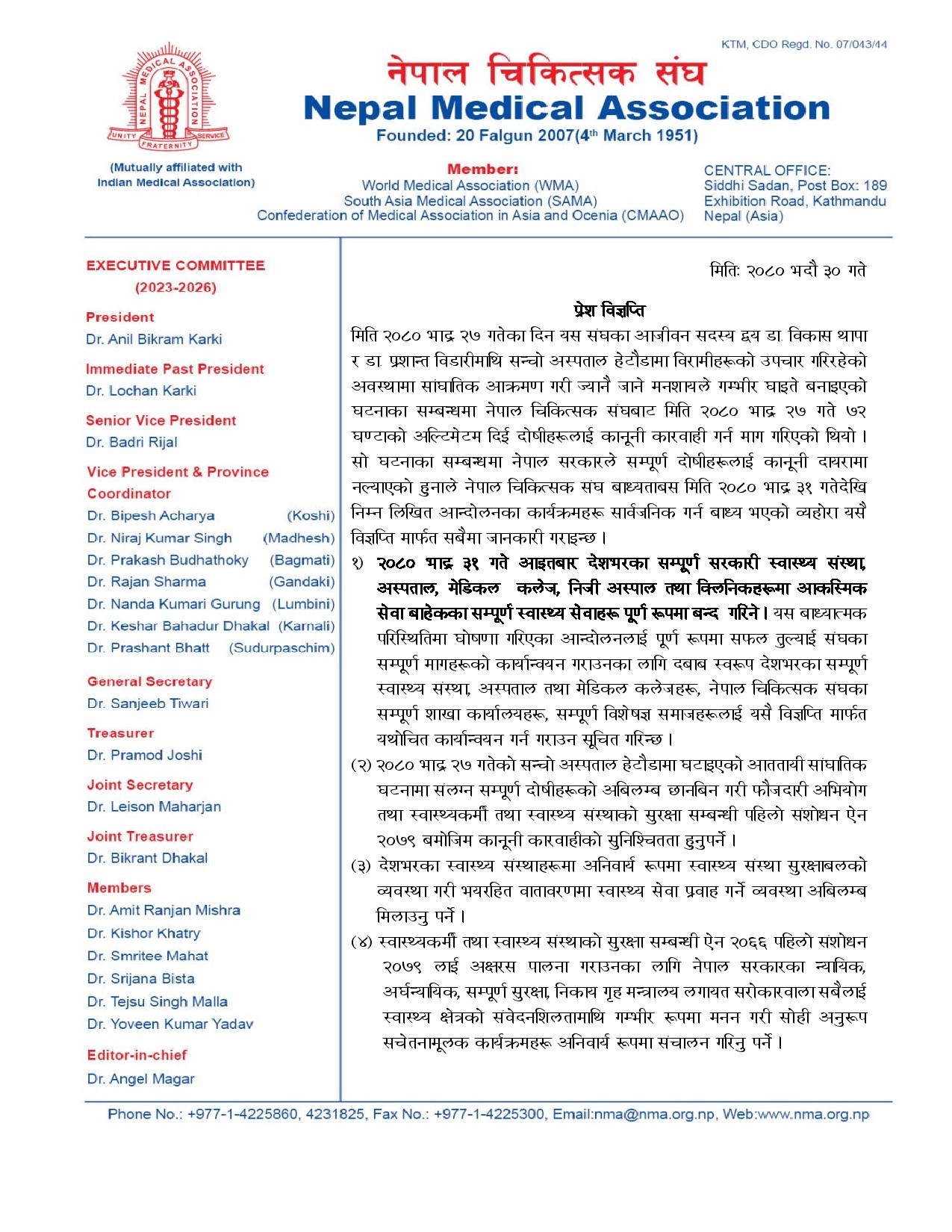 संघका अध्यक्ष डा. अनिलविक्रम कार्की र महासचिव डा. सञ्जीव तिवारीले संयुक्त रूपमा जारी गरेको विज्ञप्तिमा चिकित्सकमाथि कुटपिटको घटनाको छानबिन गरी दोषीलाई अविलम्ब फौजदारी अभियोग तथा स्वास्थ्यकर्मी तथा स्वास्थ्य संस्था सुरक्षासम्बन्धी पहिलो संशोधन ऐन २०७९ बमोजिम कारबाहीको सुनिश्चितता गर्न माग गरिएको छ।