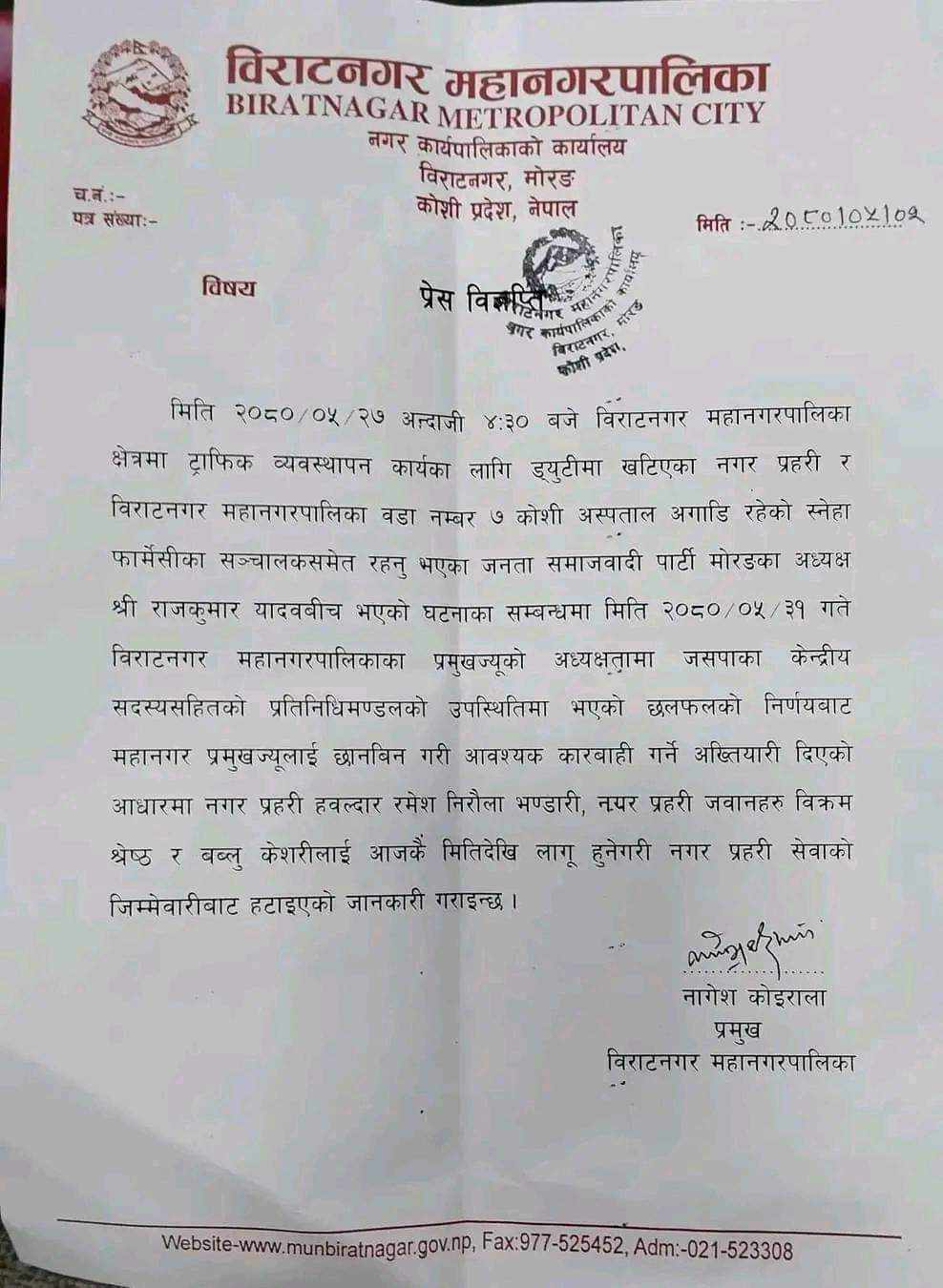 विराटनगर महानगर प्रमुख नागेश कोइरालाले जसपाका मोरङ अध्यक्ष राजकुमार यादवमाथि दुर्व्यवहार गरेको भन्दै तीन नगरप्रहरीलाई जिम्मेवारीबाट हटाएका छन्।