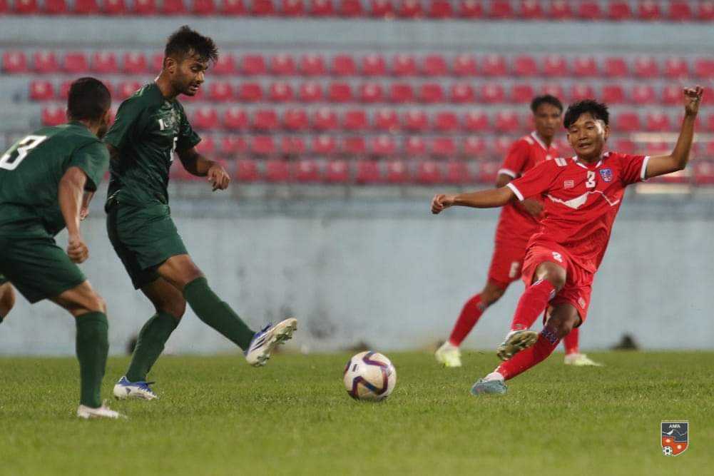 काठमाडौँ– पाकिस्तानी डिफेन्डर हाबी हुँदा घरेलु टोली नेपाल साफ यू–१९ च्याम्पियनसिपको पहिलो खेलमै पराजित भएको छ। त्रिपुरेश्वरस्थित दशरथ रंगशालामा सम्पन्न समूह ‘ए’को पहिलो खेलमा साफ यू–१९ च्याम्पियनसिपमा डेब्यू गरेको पाकिस्तानसँग नेपाल १–० गोलअन्तरले पराजित भएको हो।