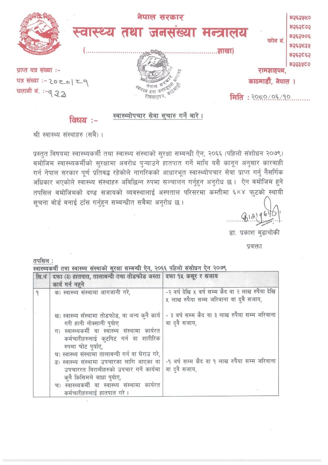 स्वास्थ्यकर्मीमाथि भइरहेका हातपातका घटनालाई लिएर बुधबार गृहमन्त्रालयमा गृहमन्त्री, स्वास्थ्यमन्त्री लगायत सम्बन्धित सरोकारवाला निकायका प्रमुखसहित बैठक बसेको थियो। त्यही बैठकले अस्पतालबाहिर सूचना टाँस्ने जिम्मा स्वास्थ्य मन्त्रालयलाई दिएकाे हाे।