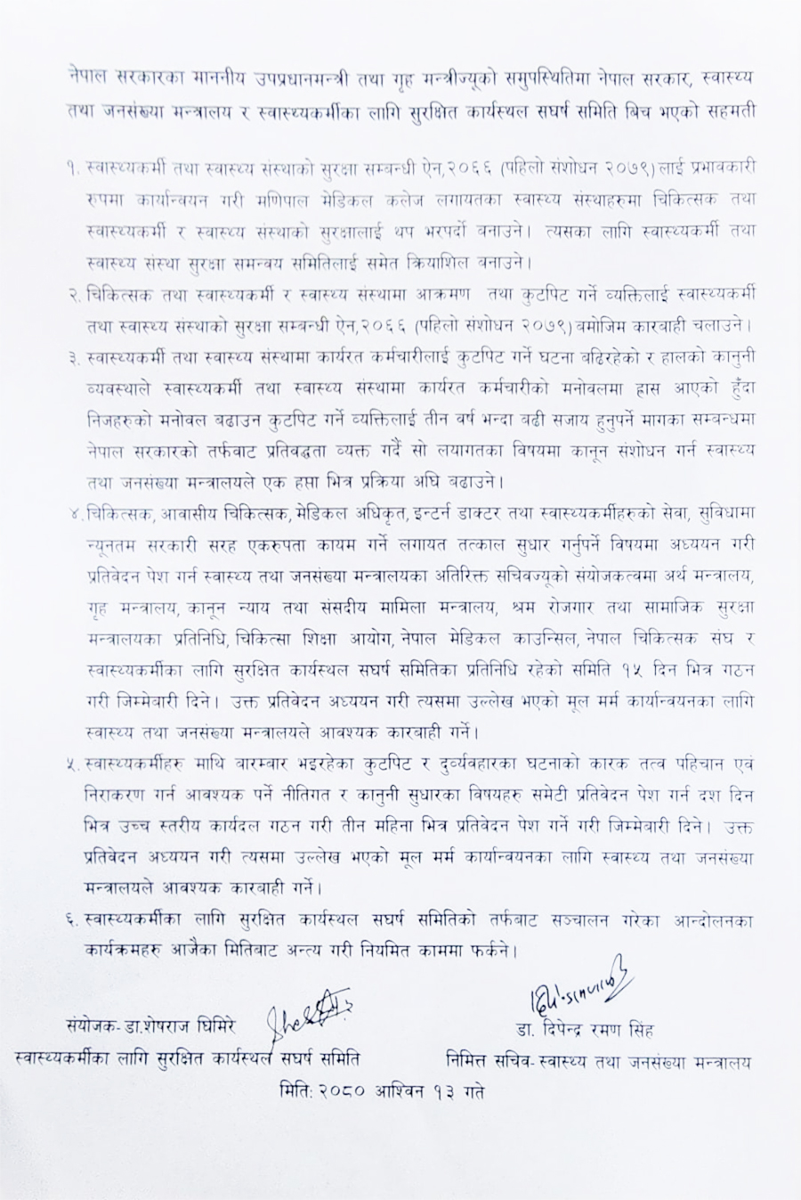 त्यस्तै, चिकित्सक तथा स्वास्थ्यकर्मी र स्वास्थ्य संस्थामा आक्रमण तथा कुटपिट गर्ने व्यक्तिलाई स्वास्थ्यकर्मी तथा स्वास्थ्य संस्थाको सुरक्षा ऐन बमोजिम कारबाही चलाइने सहमति भएको छ।