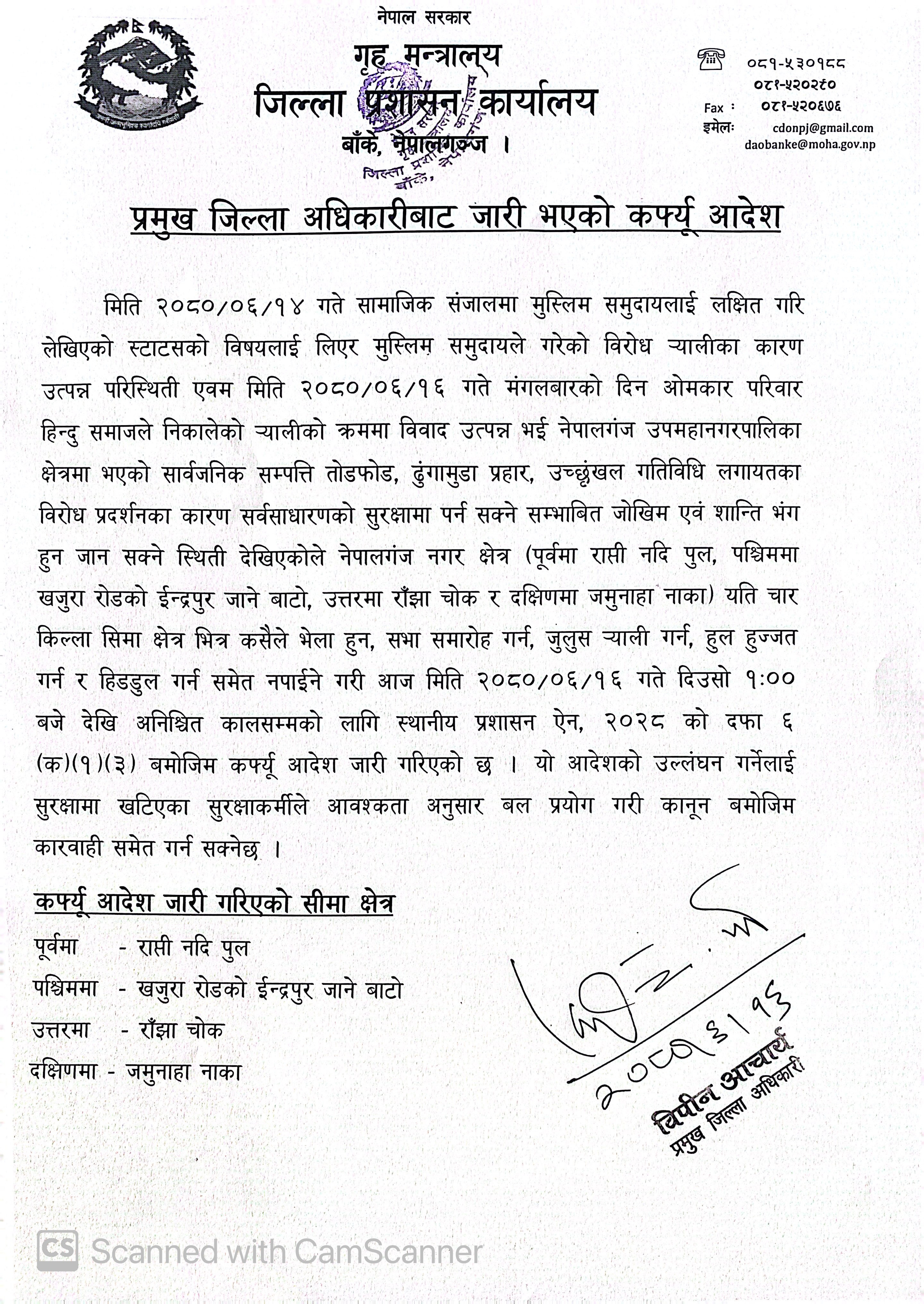 त्यसक्रममा नगर क्षेत्रमा तोडफोड र आगजनीका घटना भएपछि स्थिति नियन्त्रणका लागि कर्फ्यु लगाइएको प्रमुख जिल्ला अधिकारी विपिन आचार्यद्वारा जारी आदेशमा उल्लेख छ।