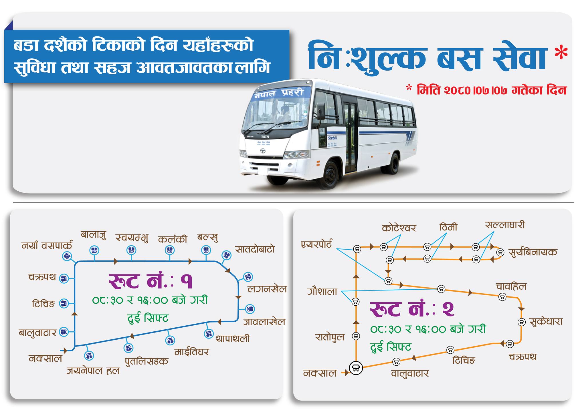 विभिन्न दुई रुटमा बस सञ्चालन हुने छ। काठमाडाैँ, भक्तपुर र ललितपुरसम्म बिहान साढे ८ बजेदेखि साँझ ४ बजेसम्म बस चल्ने प्रहरी मुख्यालयले जनाएको छ।