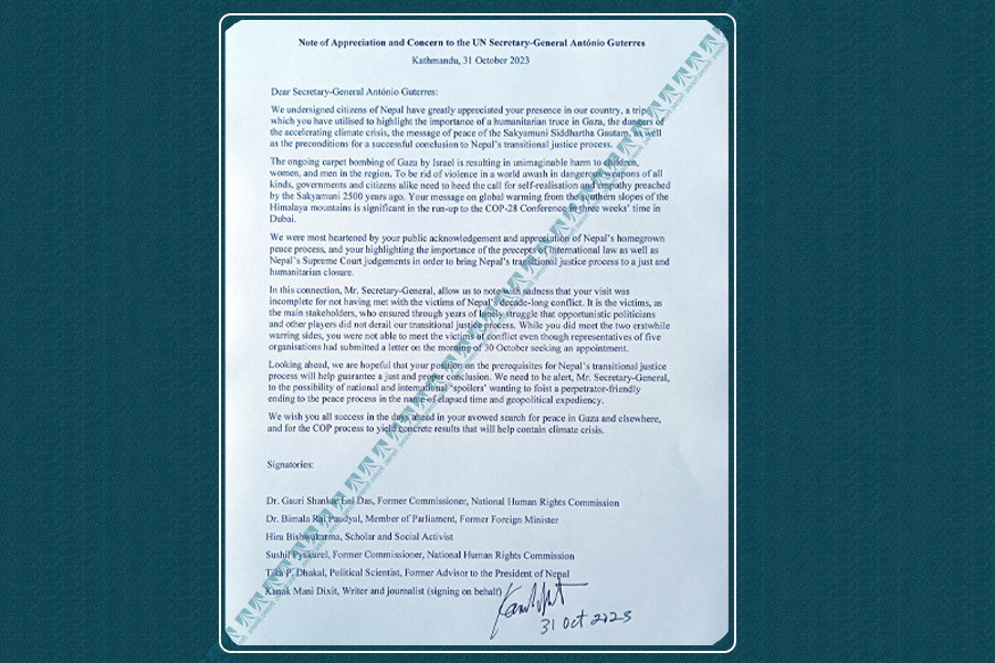 "गाजामा मानवीय युद्धविरामको महत्त्व, बढ्दो जलवायु विपत्तिका खतराहरू, बुद्ध जन्मस्थलले दिने शान्तिको सन्देशका साथै नेपालको संक्रमणकालीन न्याय प्रक्रियाको सफल निष्कर्षका लागि जरुरी पूर्वशर्तहरूलाई उजागर गर्नमा यस यात्रालाई उपयोग गर्नुभएकोमा हाम्रो देशमा तपाईंको उपस्थितिको हामी प्रशंसा गर्छौं," उनीहरूले महासचिव गुटेरेसलाई लक्षित गर्दै लेखेका छन्।