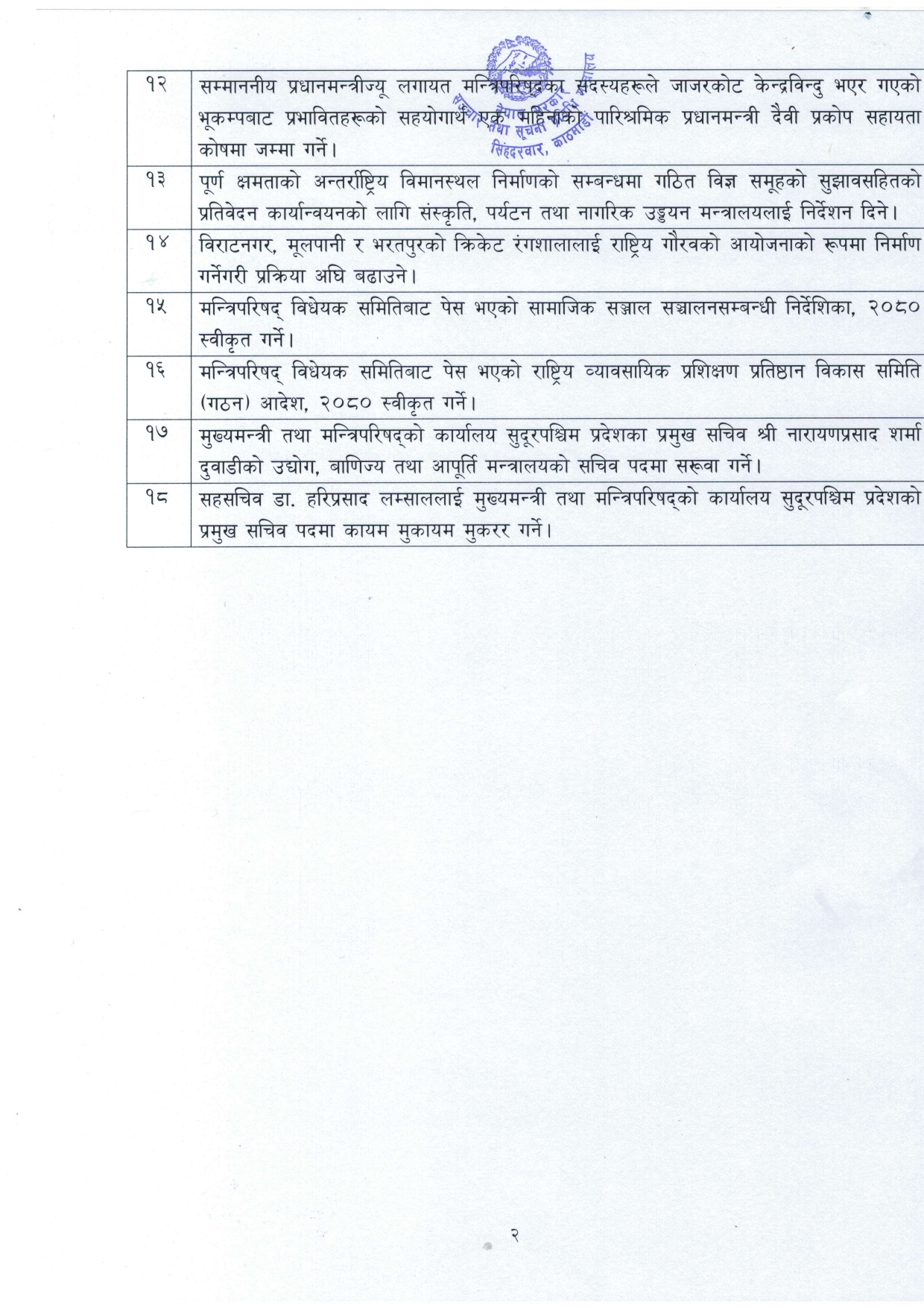 यसैगरी, मुख्यमन्त्री तथा मन्त्रिपरिषद्को कार्यालय सुदूरपश्चिम प्रदेशका प्रमुख सचिव नारायणप्रसाद शर्मा दवाडीको उद्योग, वाणिज्य तथा आपूर्ति मन्त्रालयको सचिव पदमा सरुवा गर्ने र सहसचिव डा. हरिशरण लम्साललाई मुख्यमन्त्री तथा मन्त्रिपरिषद्को कार्यालय सुदूरपश्चिम प्रदेशको प्रमुख सचिव पदमा कायममुकायम मुकरर गर्ने निर्णय सरकारले गरेको छ।