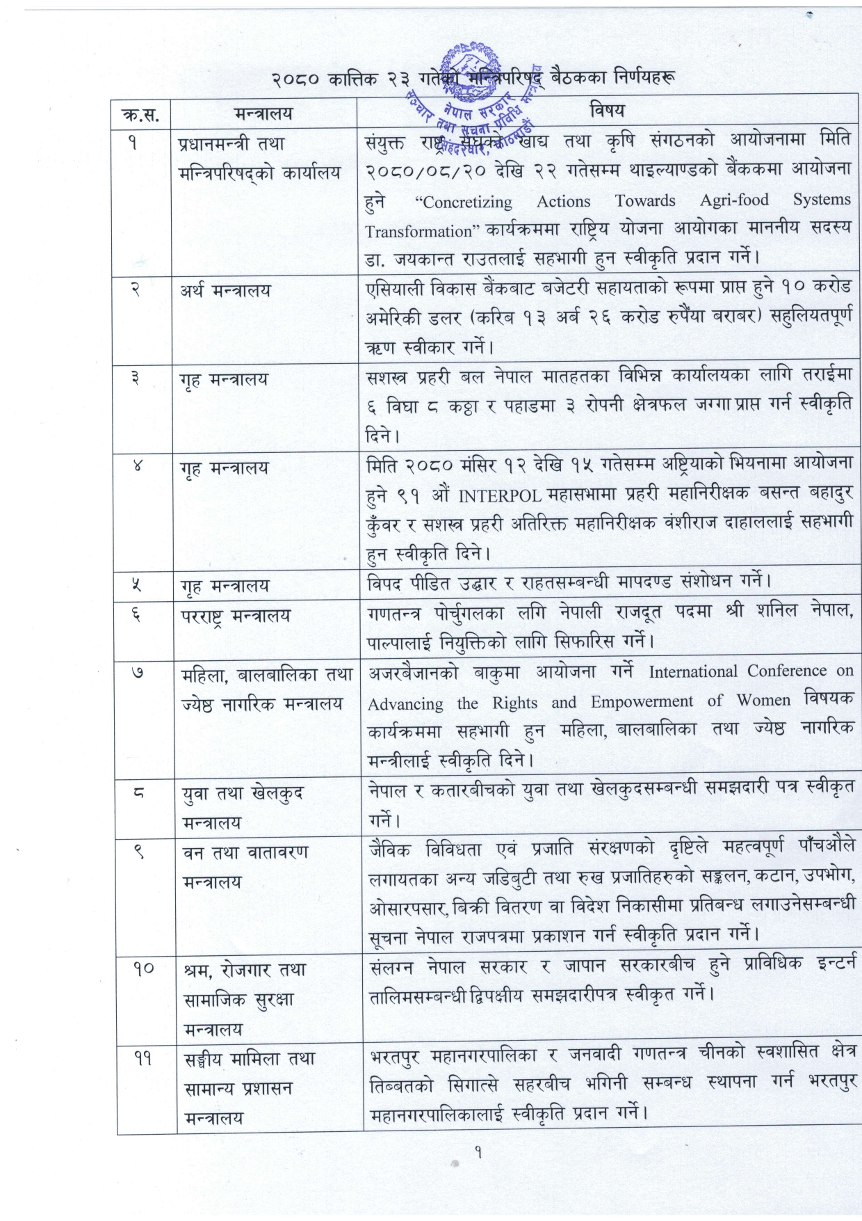 सरकारले जैविक विविधता एवं प्रजाति संरक्षणको दृष्टिले महत्त्वपूर्ण पाँचऔँलेलगायतका जडीबुटी तथा रूख प्रजातिहरूको संकलन, कटान, उपभोग, ओसारपसार, बिक्री वितरण वा विदेश निकासीमा प्रतिबन्ध लगाउनेसम्बन्धी सूचना नेपाल राजपत्रमा प्रकाशन गर्न स्वीकृति दिएको छ। सरकारले नेपाल र जापानबीच हुने प्राविधिक इन्टर्न तालिमसम्बन्धी द्विपक्षीय समझदारीपत्र स्वीकृत गर्ने निर्णय पनि गरेको छ।