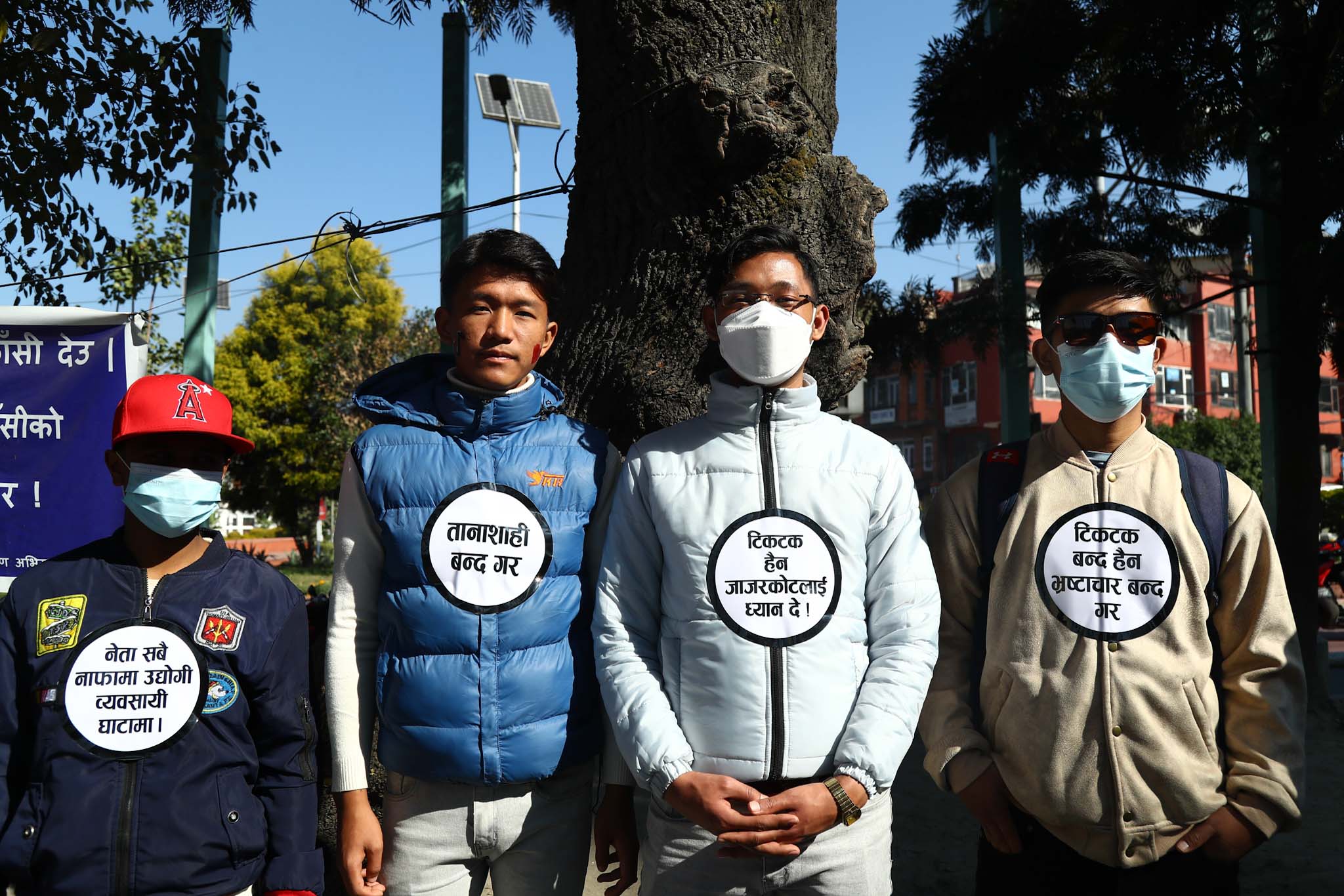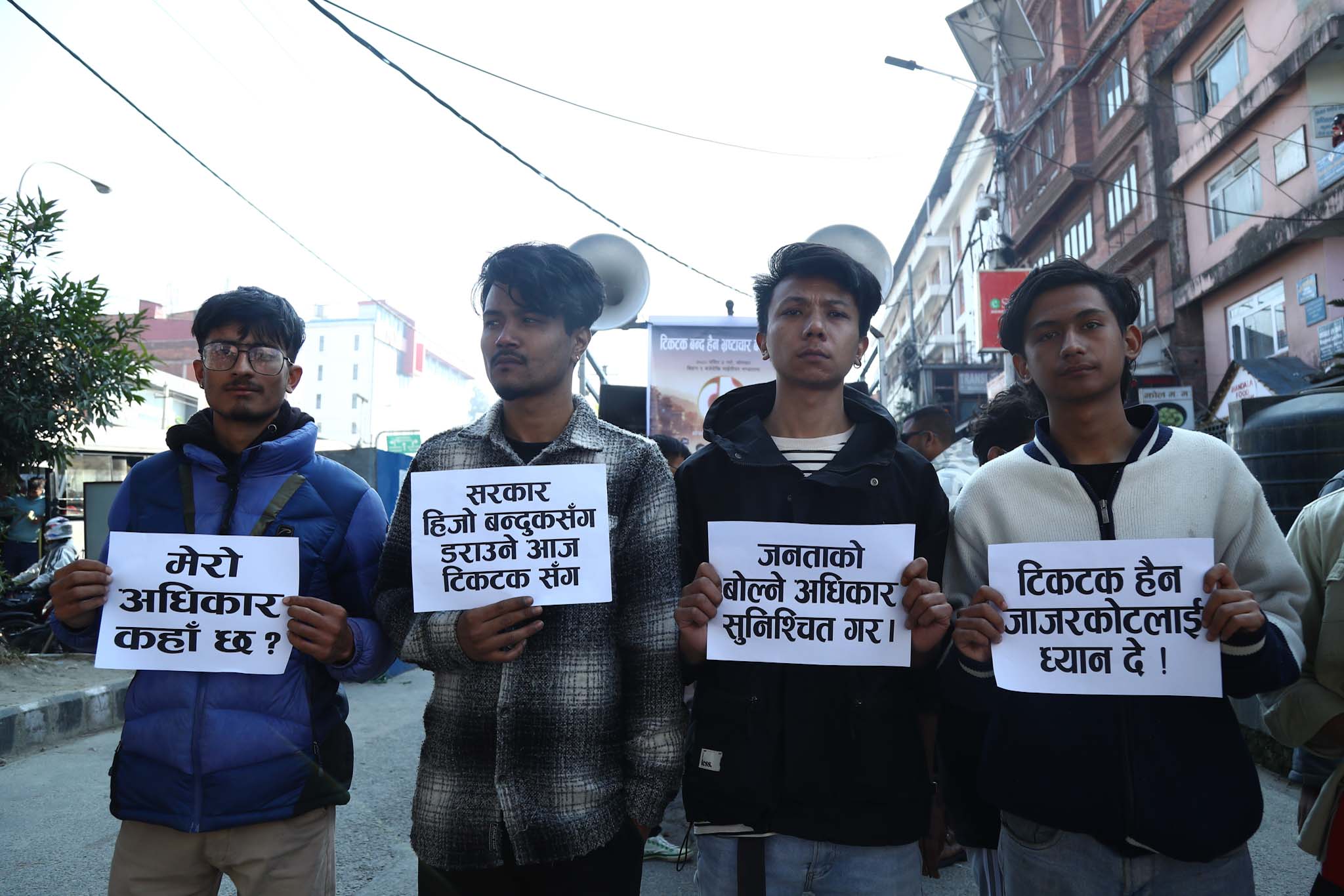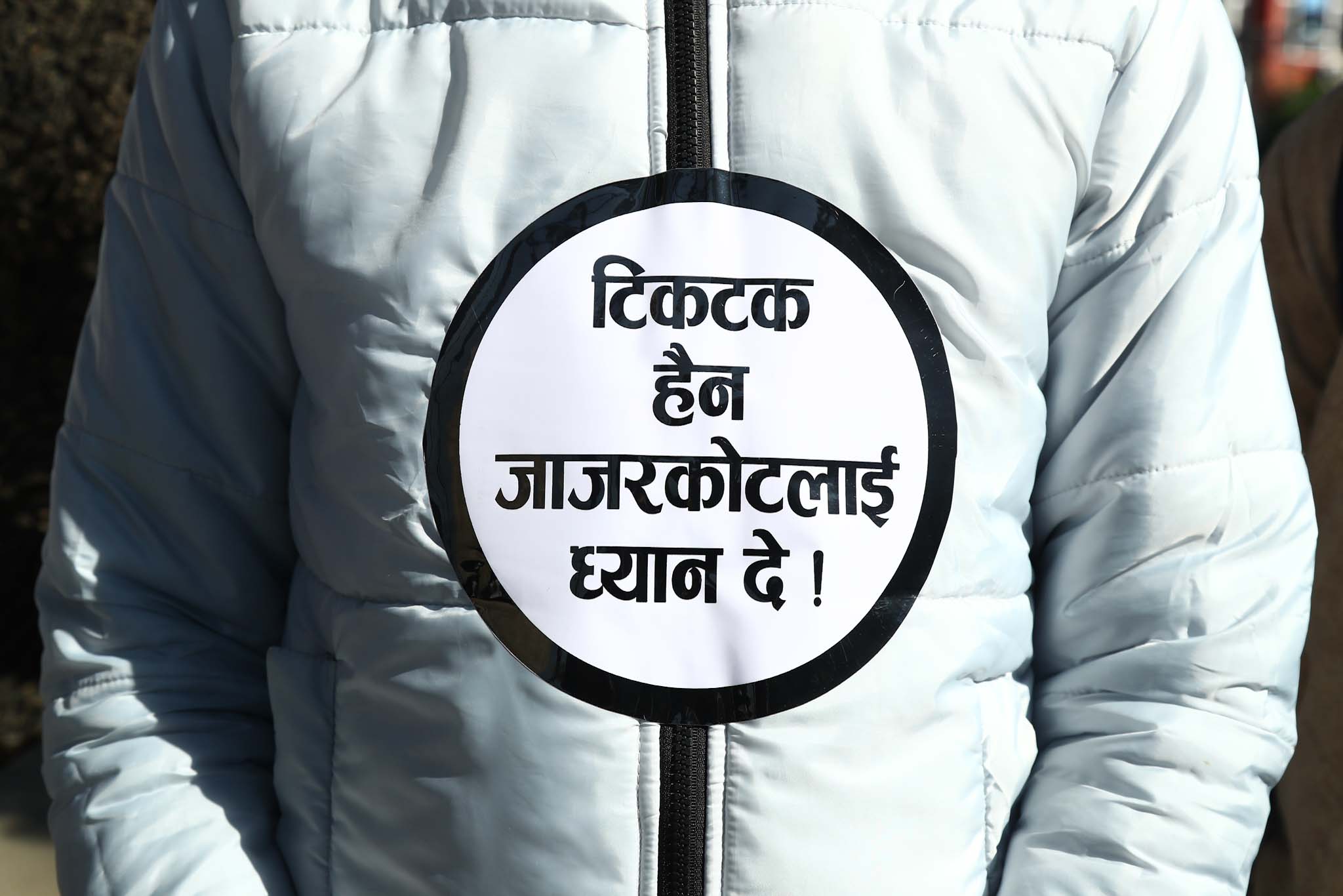 टिकटक होइन भ्रष्ट्राचार नियन्त्रण गर्नु पर्ने, जाजरकोटमा ध्यान दिनु पर्ने जस्ता प्लाकार्ड लिएर युवाहरूले प्रदर्शन गरेका छन्।