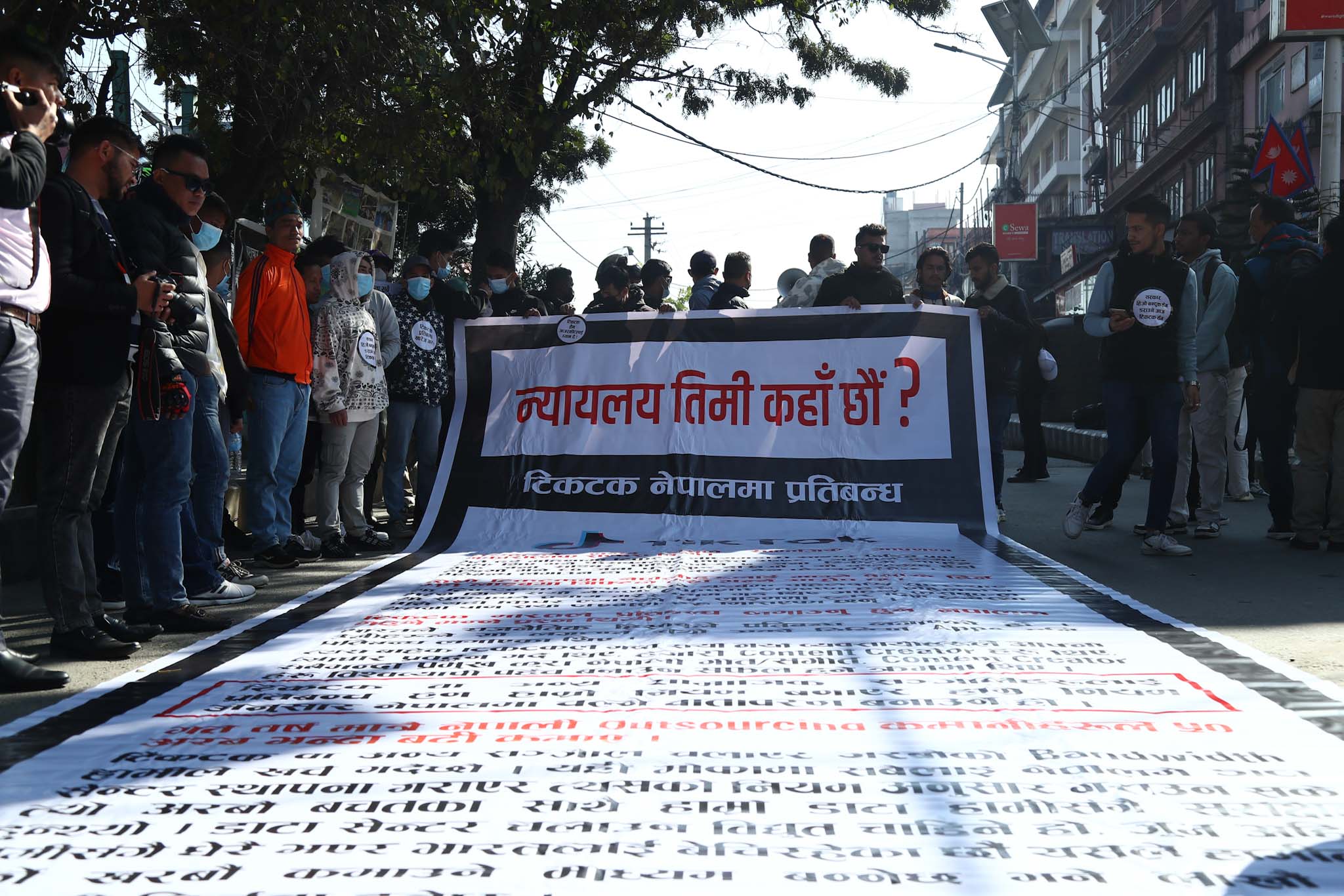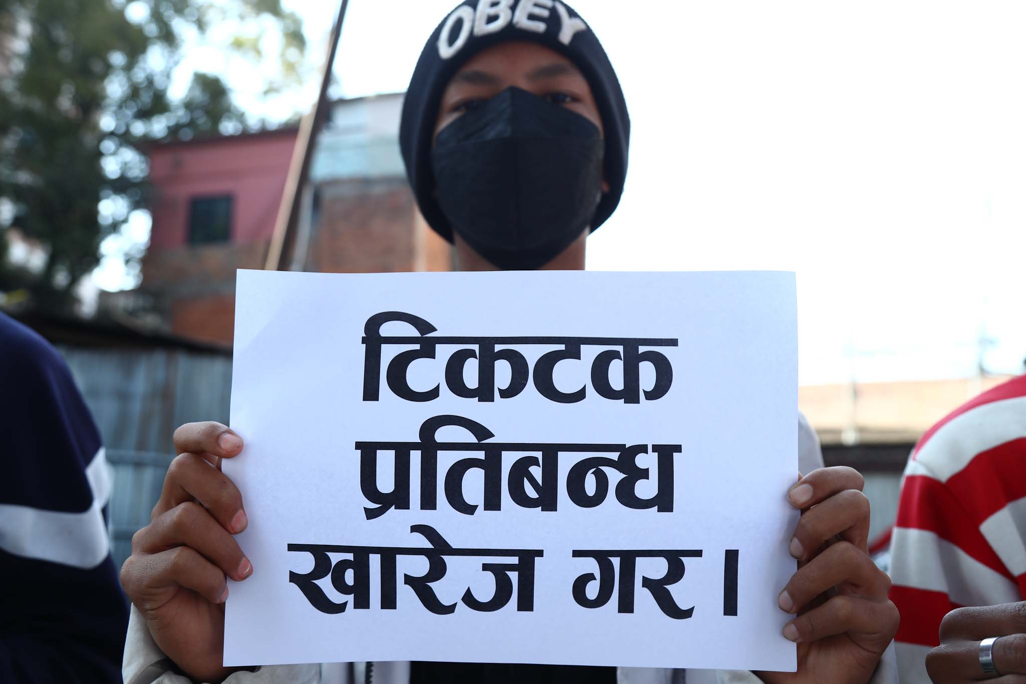 काठमाडाैँ– सरकारले टिकटक प्रतिबन्ध गरेको विरोधमा युवाहरूले काठमाडाैँको माइतीघर मण्डलमा सोमबार प्रदर्शनी गरेका छन्। उनीहरूले टिकटक होइन भ्रष्ट्राचार नियन्त्रण गर्नु पर्ने, जाजरकोटमा ध्यान दिनु पर्ने जस्ता प्लाकार्ड लिएर प्रदर्शन गरेका थिए।