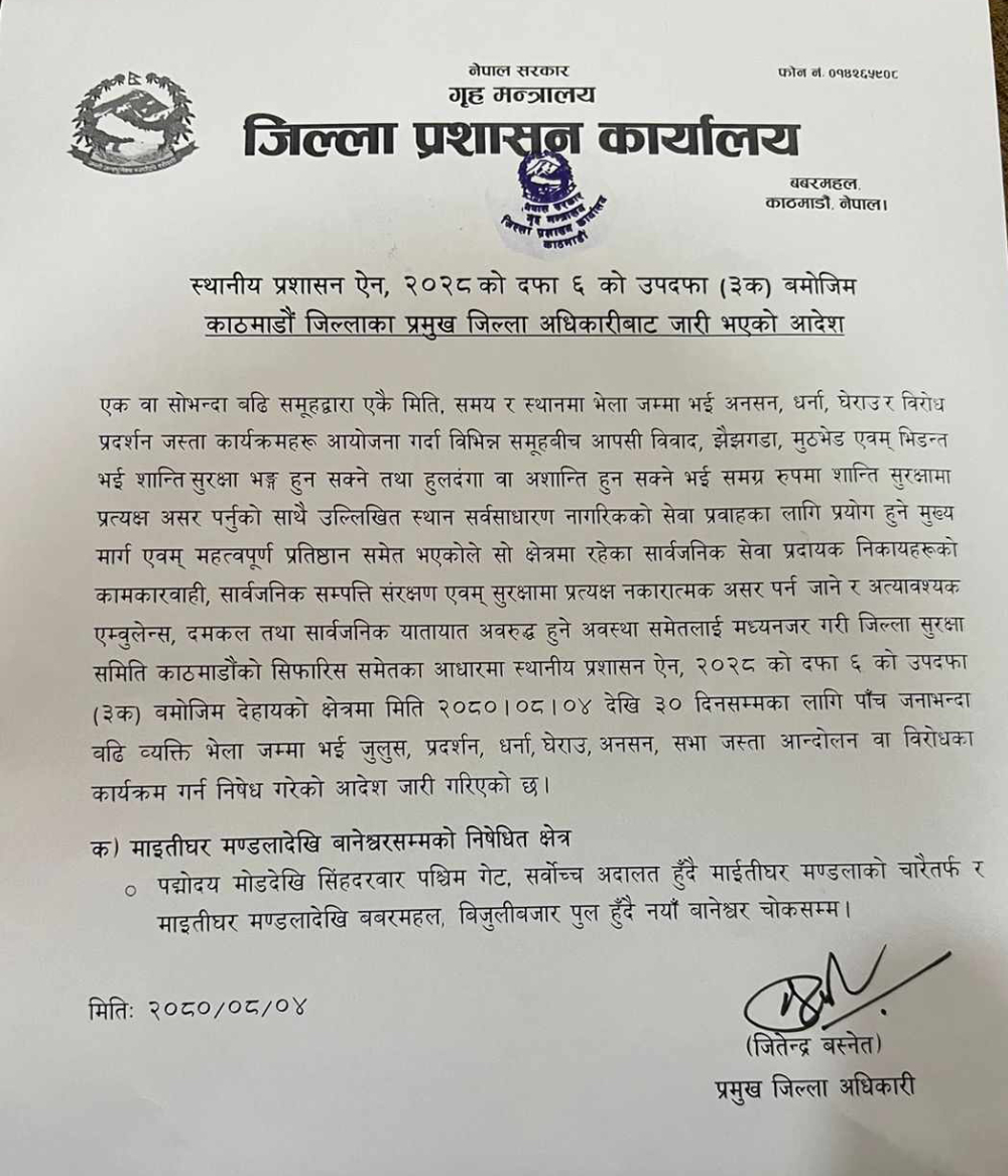 काठमाडौँका प्रमुख जिल्ला अधिकारी जितेन्द्र बस्नेतले सोमबार एक आदेश जारी गर्दै मंसिर ४ देखि ३० दिनसम्मका लागि माइतीघरदेखि नयाँ बानेश्वरसम्मको क्षेत्रलाई निषेधित घोषित गरिएको जानकारी दिएका हुन्।