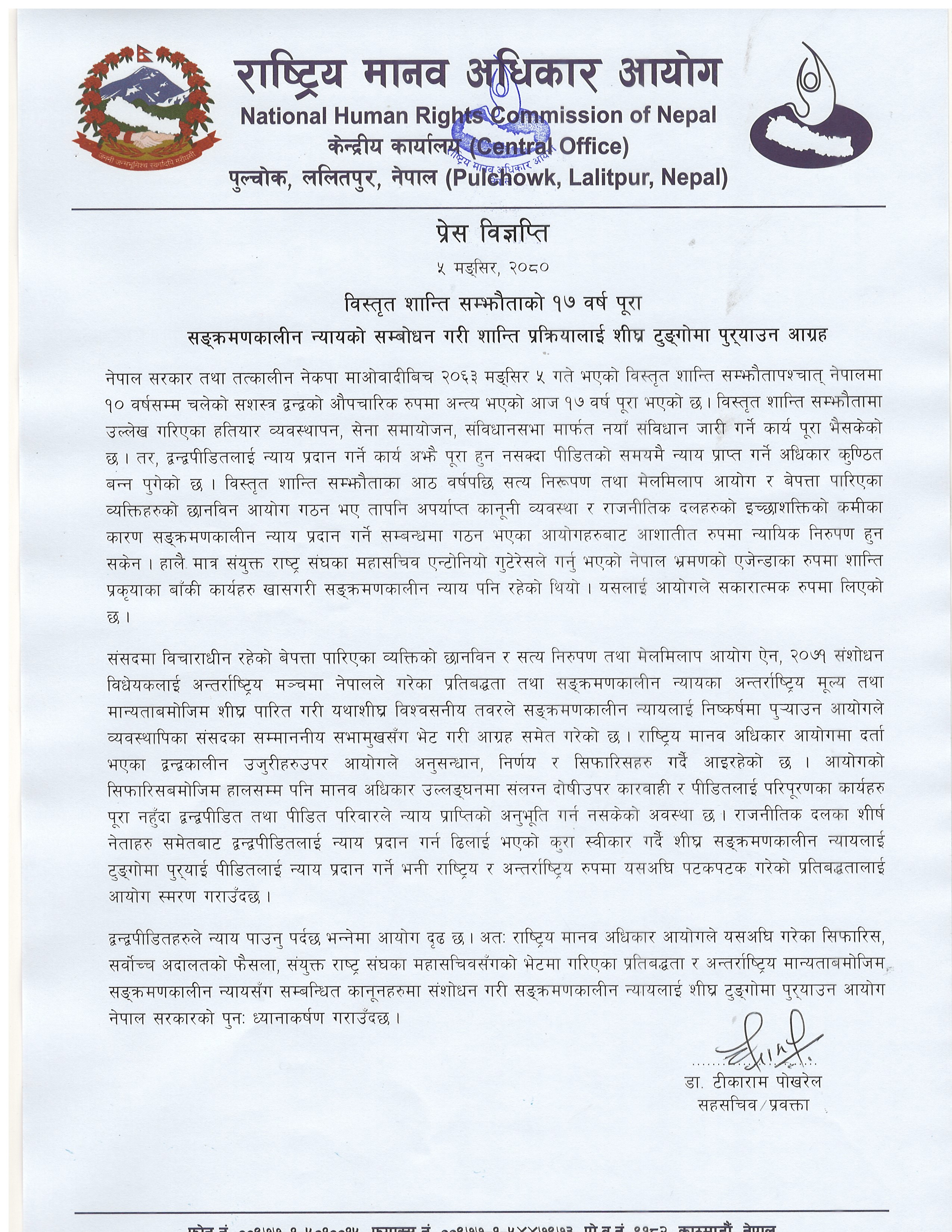 “राष्ट्रिय मानवअधिकार आयोगमा दर्ता भएका द्वन्द्वकालीन उजुरीहरूउपर आयोगले अनुसन्धान, निर्णय र सिफारिसहरू गर्दै आएको छ। आयोगको सिफारिसबमोजिम हालसम्म पनि मानवअधिकार उल्लंघनमा संलग्न दोषीउपर कारबाही र पीडितलाई परिपूरणका कार्यहरू पूरा नहुँदा द्वन्द्वपीडित तथा पीडित परिवारले न्याय प्राप्तिको अनुभूति गर्न नसकेको अवस्था छ। राजनीतिक दलका शीर्ष नेताहरू समेतबाट द्वन्द्वपीडितलाई न्याय प्रदान गर्न ढिलाइ भएको कुरा स्वीकार गर्दै संक्रमणकालीन न्यायलाई टुंगोमा पुर्याई पीडितलाई न्याय प्रदान गर्न भनी राष्ट्रिय र अन्तर्राष्ट्रिय रूपमा यसअघि सरकारले पटक–पटक गरेको प्रतिबद्धतालाई आयोग स्मरण गराउँदछ,” विज्ञप्तिमा भनिएको छ।