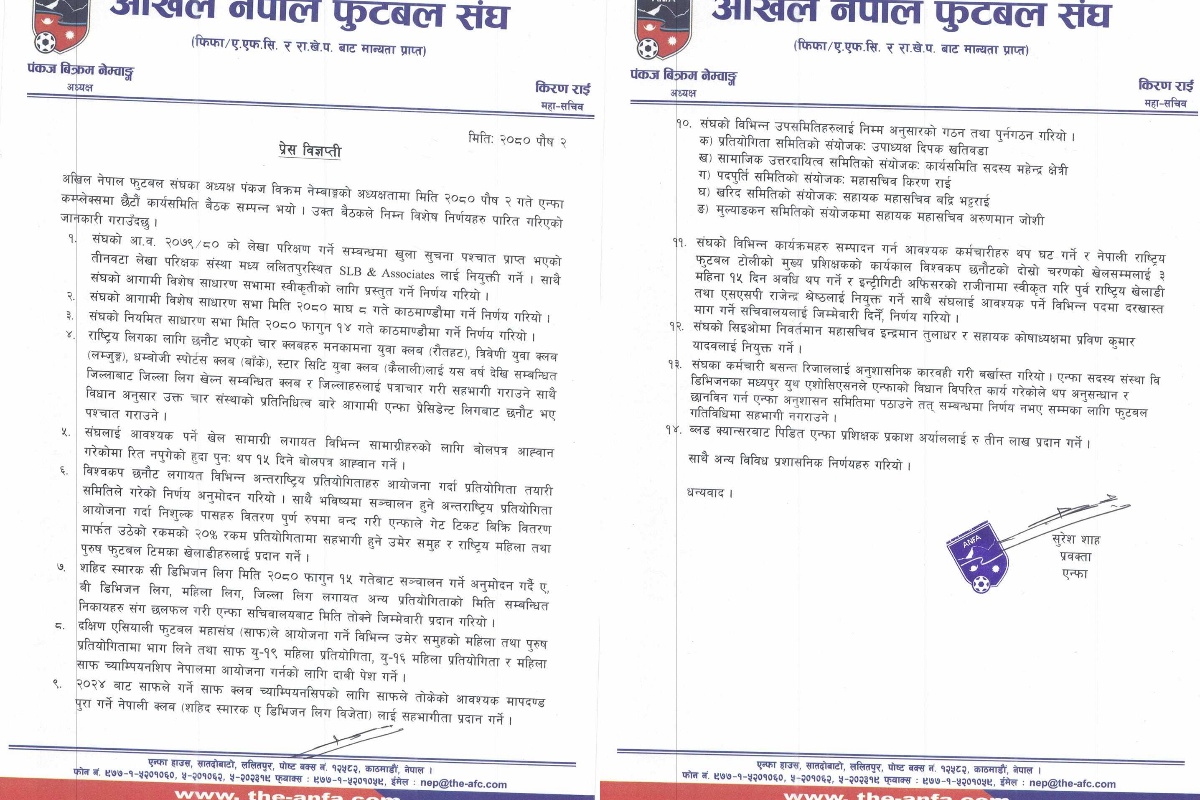 त्यस्तै, बैठकले एन्फाको प्रमुख कार्यकारी अधिकृत (सीईओ)मा संकटा क्लबका अध्यक्षसमेत रहका इन्द्रमान तुलाधार नियुक्त भएको छ।