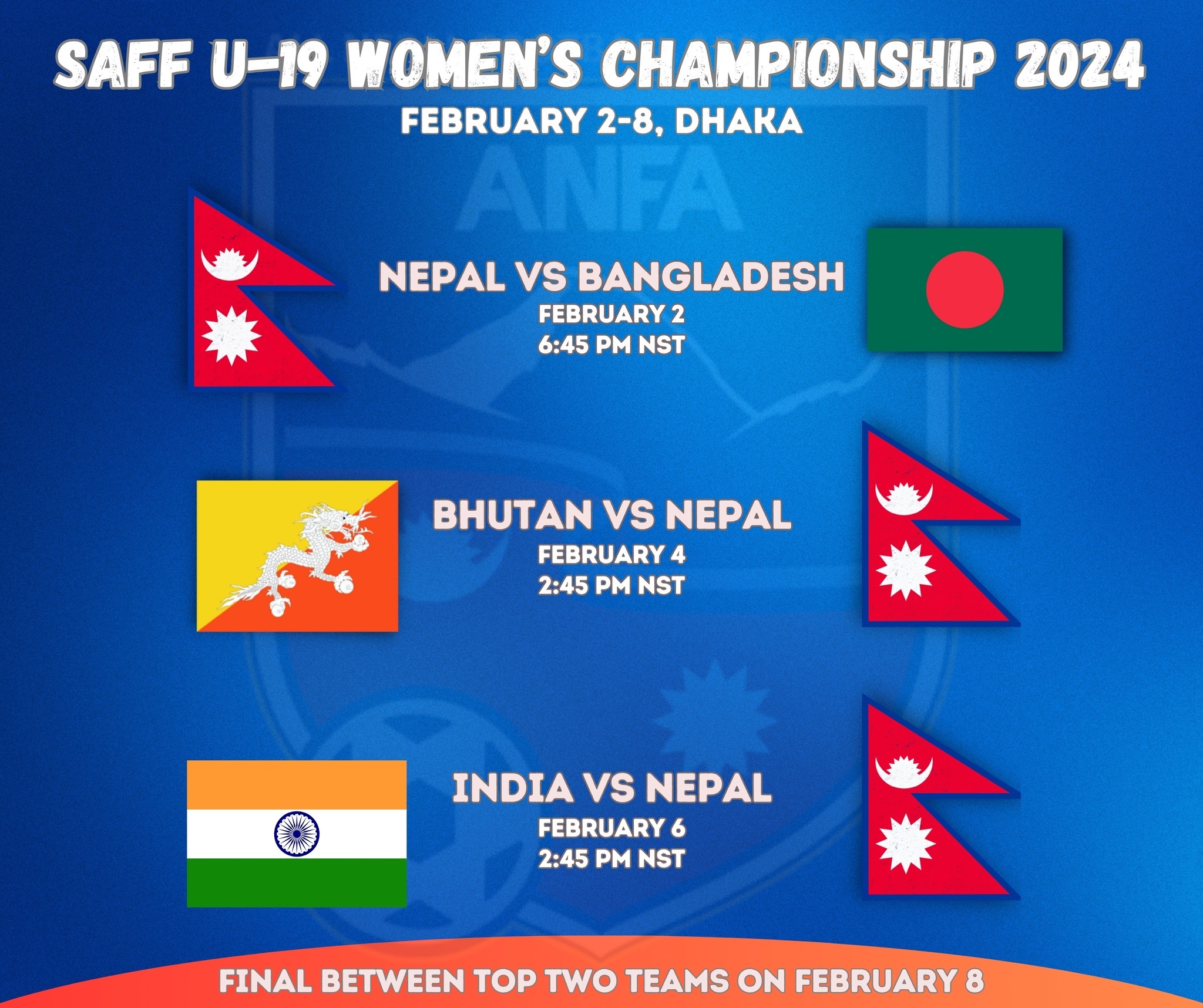 प्रतियोगिताको उद्घाटन खेलमा बंगलादेश र नेपाल भिड्नेछन्। नेपालले दोस्रो खेल फ्रेबुअरी ४ मा भुटान र अन्तिम खेल भारतसँग फ्रेबुअरी ६ मा खेल्ने छ।
