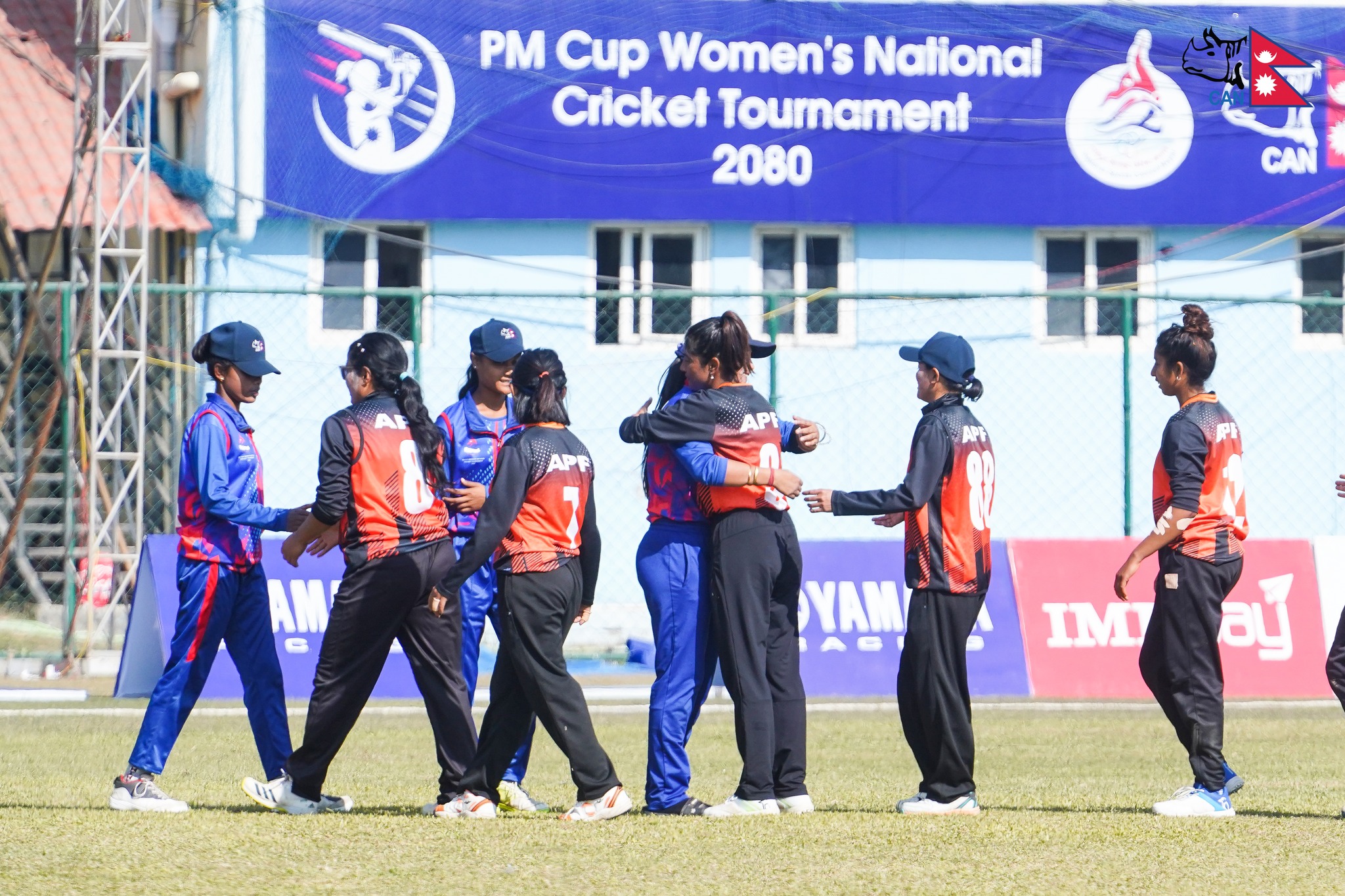 एपीएफको जितमा इन्दु बर्माले अर्धशतकीय इनिङ्स खेलिन्। उनी ५० बलमा ३ चौका र १ छक्कासहित ५६ रनमा अविजित रहिन्। कप्तान सीता रानामगरले ३७ बलमा ४५, रोमा थापाले १६ बलमा १८ तथा ज्योती पाण्डेले १७ बलमा १२ रन बनाइन्।
