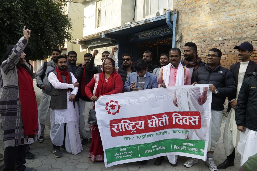 जनमत पार्टीको विद्यार्थी संगठनको आयोजनामा भएको कार्यक्रममा अध्यक्ष राउतसहित नेता कार्यकर्ता धोती लगाएर प्रदर्शनमा उत्रिएका थिए।