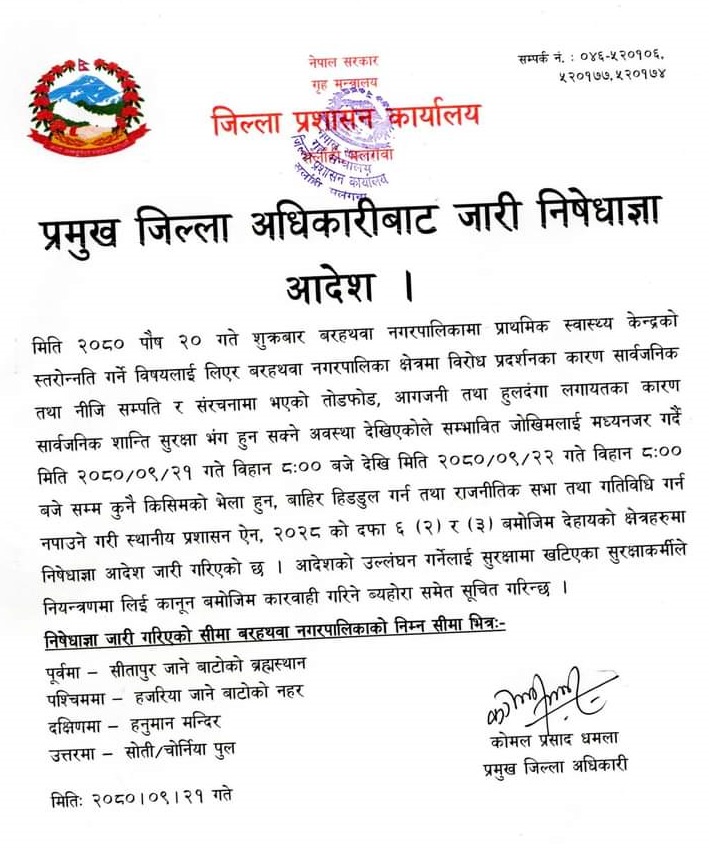नगरपालिकाको पूर्वमा सीतापुर जाने बाटोको बह्मस्थान, पश्चिममा हजरिया जाने बाटोको नहर, दक्षिणमा हनुमान मन्दिर र उत्तरमा सोती चोर्निया पुलभित्र निषेधाज्ञा लागू हुनेछ।