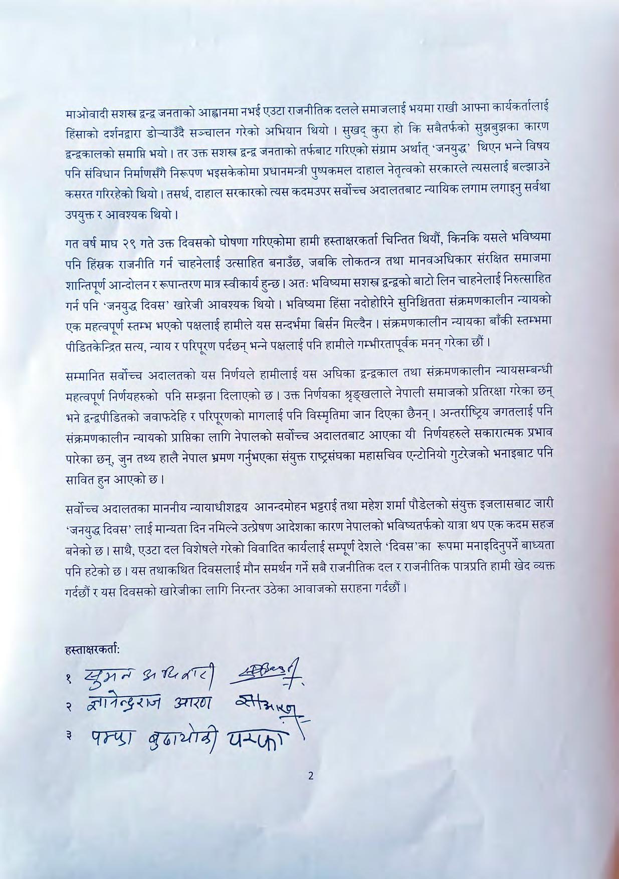 उनीहरूले सर्वोच्चका न्यायाधीश आनन्दमोहन भट्टराई र महेश शर्मा पौडेलको संयुक्त इजलासबाट ‘जनयुद्ध दिवस’लाई मान्यता दिन नमिल्ने उत्प्रेषणको आदेशका कारण नेपालको भविष्यतर्फको यात्रामा थप एक कदम सहज भएको पनि उल्लेख गरेका छन्। “एउटा दल विशेषले गरेको विवादित कार्यलाई सम्पूर्ण देशले दिवसका रूपमा मनाइदिनुपर्ने बाध्यता पनि हटेको छ,” विज्ञप्तिमा भनिएको छ।