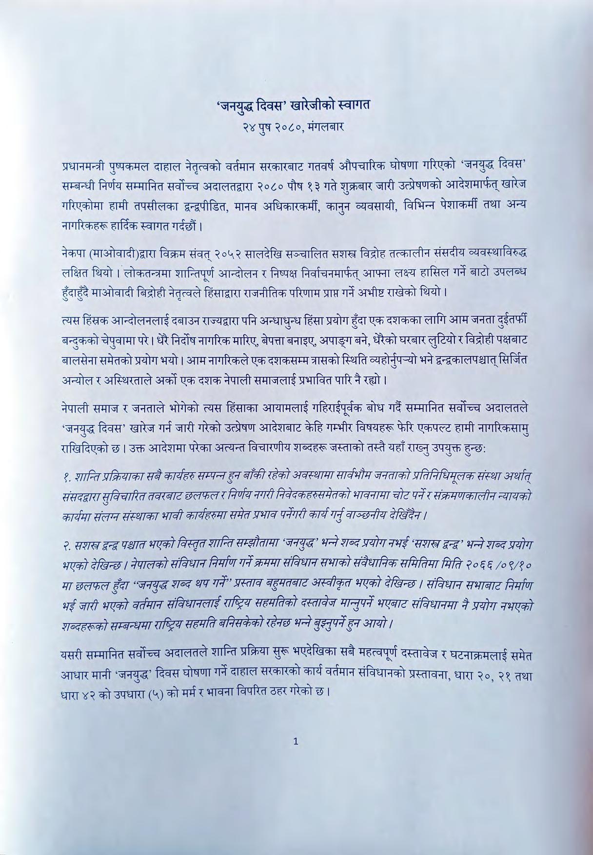 प्रधानमन्त्री पुष्पकमल दाहाल नेतृत्वको वर्तमान सरकारले गत वर्ष औपचारिक रूपमा ‘जनयुद्ध दिवस’का नाममा सार्वजनिक बिदा दिने निर्णय गरेको थियो। सरकारको सो निर्णयविरुद्ध परेको रिटमाथि सुनुवाइ गर्दै सर्वोच्चले पुस १३ गते ‘जनयुद्ध दिवस’लाई मान्यता दिन नमिल्ने उत्प्रेषणको आदेश जारी गरेको थियो।