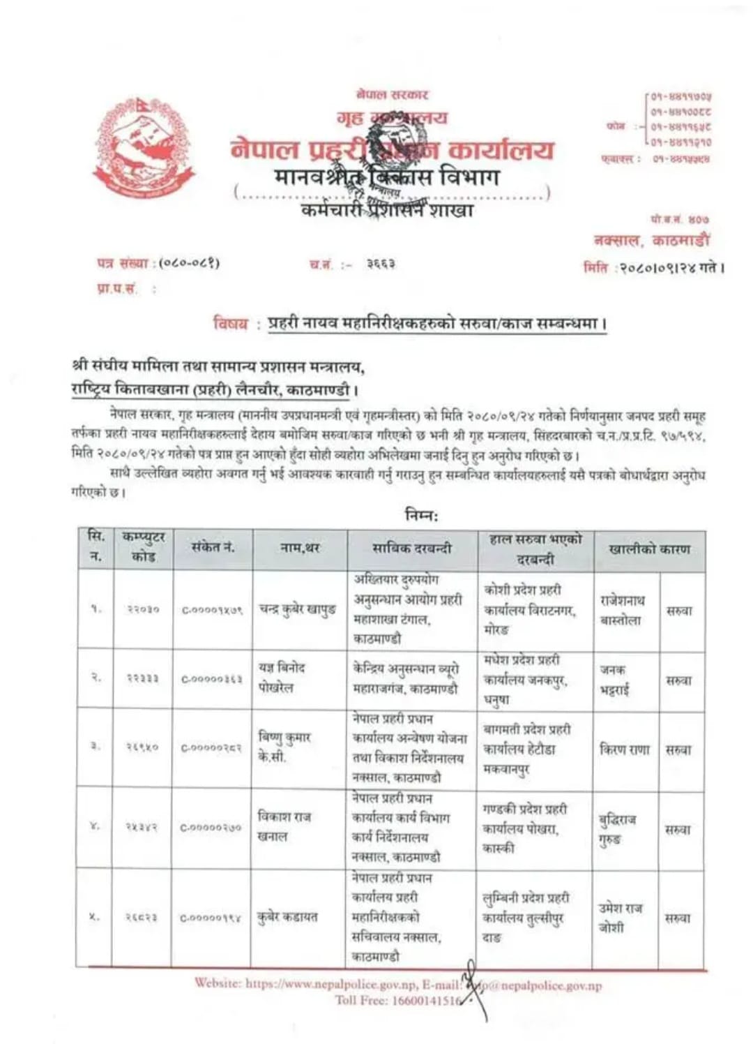त्यस्तै, प्रहरी महानिरीक्षकको सचिवालयबाट डीआईजी कुबेर कडायतको लुम्बिनी प्रदेश प्रहरी कार्यालयमा सुरुवा हुँदा काठमाडौँ उपत्यका प्रहरी कार्यालय, रानीपोखरीबाट डीआईजी लालमणि आचार्य कर्णाली प्रदेश प्रहरी कार्यालय पुगेका छन्।