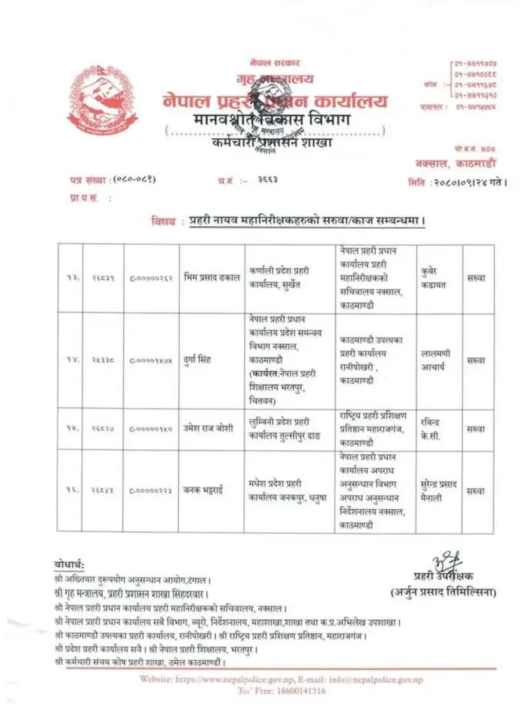 त्यस्तै, प्रहरी प्रधान कार्यालय अन्वेषण योजना तथा निर्देशनालय, नक्सालबाट डीआईजी विष्णुकुमार केसीको बागमती प्रदेश प्रहरी कार्यालयमा सुरुवा भएको छ भने प्रहरी प्रधान कार्यालय कार्य विभाग कार्य निर्देशनालय नक्सालबाट विकासराज खनाल गण्डकी प्रदेश प्रहरी कर्यालय पुगेका छन्।