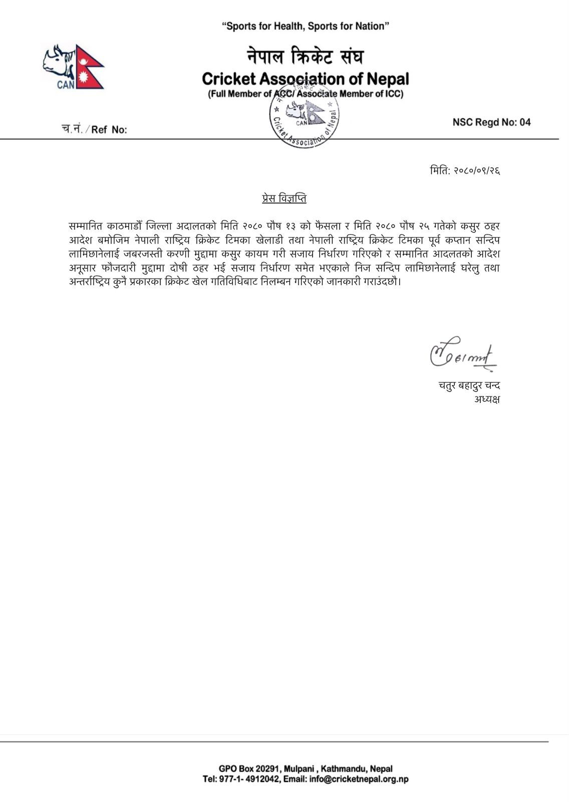 क्यानका अध्यक्ष चतुरबहादुर चन्दले बिहीबार एक विज्ञप्ति जारी गर्दै लामिछानेलाई घरेलु तथा अन्तर्राष्ट्रिय क्रिकेटबाट निलम्बन गरिएको जनाएका छन्।