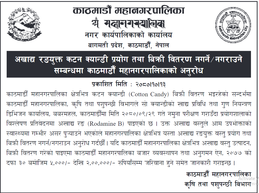 “कटन क्यान्डीले आम उपभोक्ताको स्वास्थ्यमा गम्भीर असर पुर्याउने भएकाले महानगर क्षेत्रभित्र यस्ता अखाद्य रङयुक्त वस्तु प्रयोग तथा बिक्री नगर्न/नगराउन अनुरोध गर्दछौँ,” सूचनामा भनिएको छ, “काठमाडौँ महानगरभित्र उत्पादन तथा बिक्री गरेको पाइए पाँच हजारदेखि दुई लाख रुपैयाँसम्म जरिबाना हुनेसमेत जानकारी गराइन्छ।”
