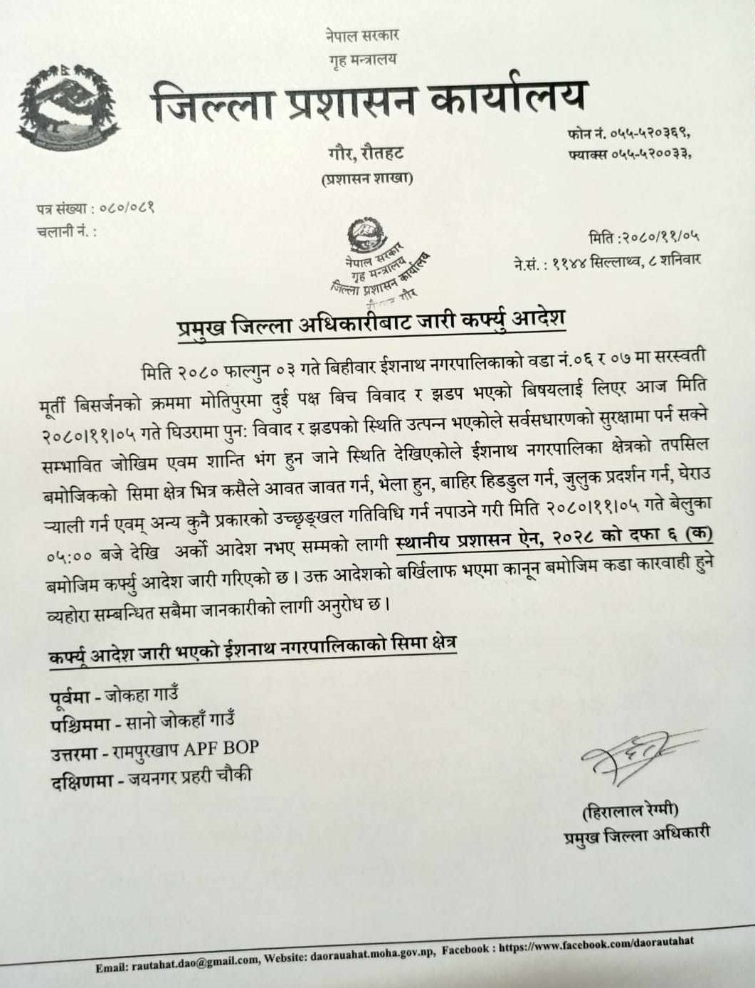 सरस्वतीको मूर्ति सेलाउने विषयमा दुई पक्षबीच झडप भएपछि रौतहट प्रशासनले ईशनाथ नगरपालिकामा अर्को आदेश नभएसम्मका लागि कर्फ्यु आदेश जारी गरेको छ।