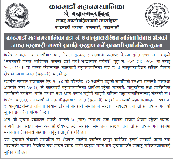 “सात दिनभित्र उक्त ललितानिवास क्षेत्रमा रहेका व्यक्ति, कम्पनी तथा संघ संस्थाहरू सो क्षेत्रबाट हटी सरकारी सम्पत्तिको संरक्षण तथा उचित प्रबन्ध गर्ने कार्यमा महानगरपालिकालाई सहयोग गर्नुहुन अनुरोध गरिन्छ,” सूचनामा भनिएको छ।
