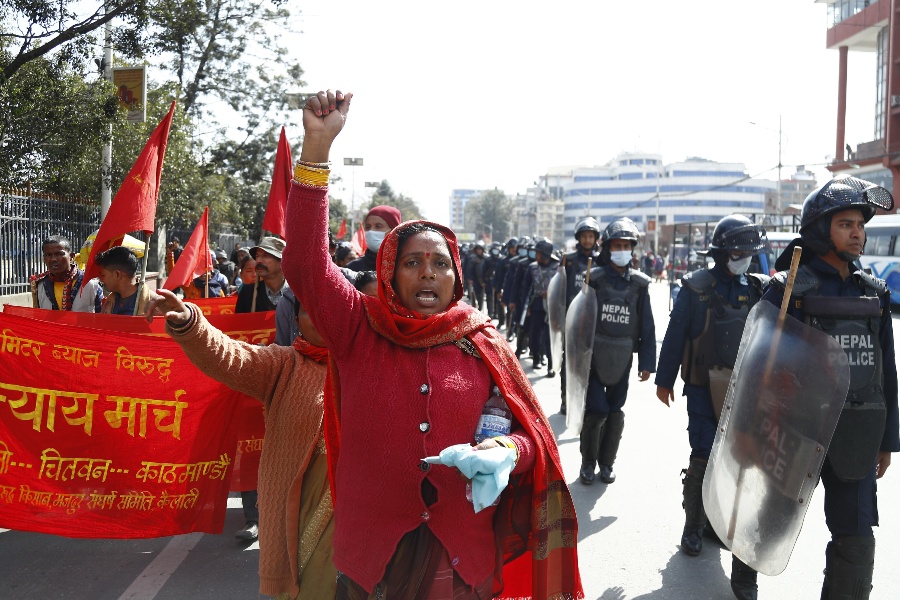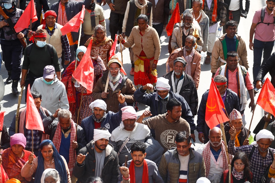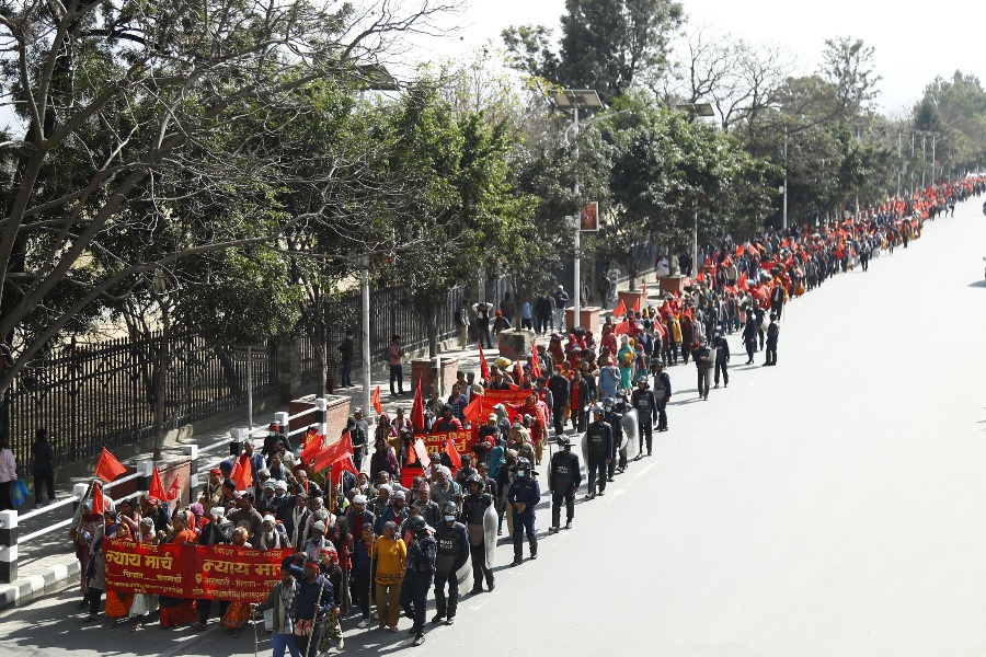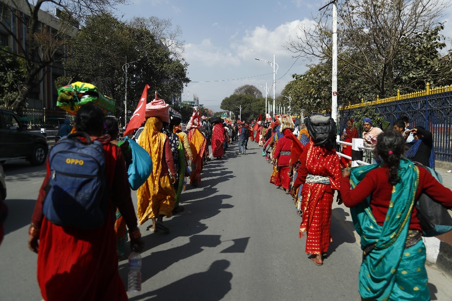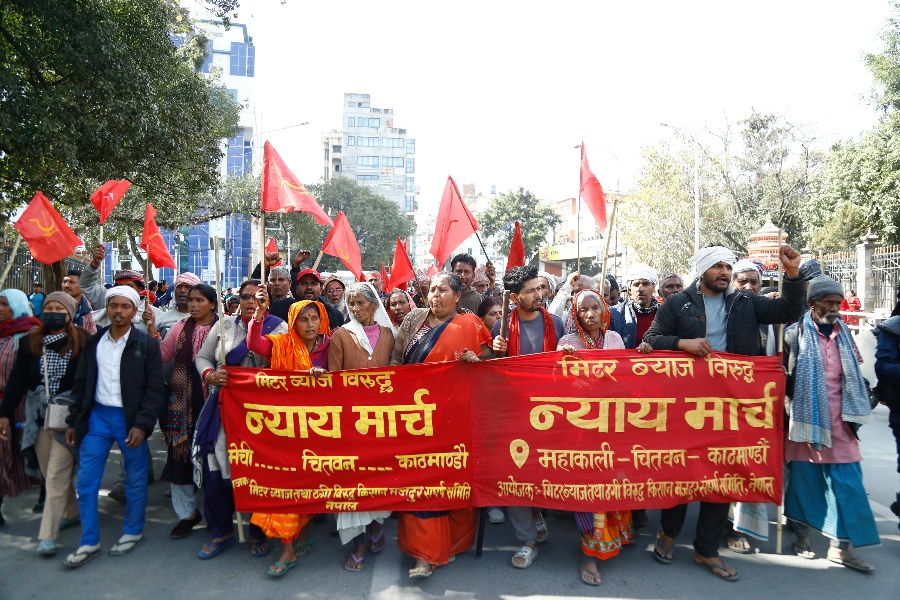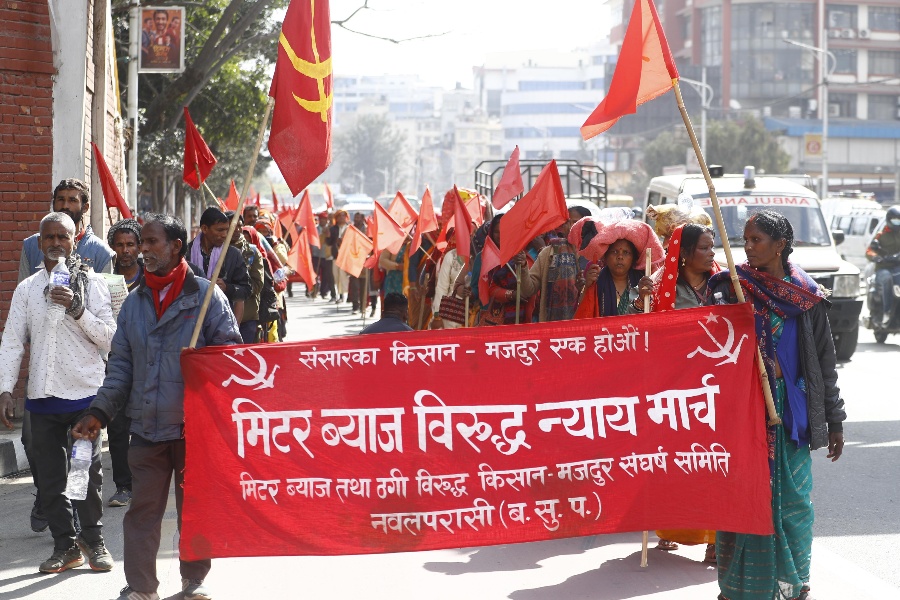 काठमाडौँ– न्याय खोज्दै पैदलयात्रा गरी देशभरबाट काठमाडौँमा आएका मिटरब्याजी पीडितहरूले शुक्रबार विरोध प्रदर्शन गरेका छन्। उनीहरूले त्रिभुवन पार्कबाट हिँड्दै आएर रत्नपार्कमा विरोध प्रदर्शन गरेका हुन्। मिटरब्याजविरुद्ध न्याय मार्च नाम दिएर उनीहरूले विरोध प्रदर्शन गर्दै आएका छन्। शुक्रबार भृकुटीमण्डपबाट सिंहदरबार जाने क्रममा भृकुटीमण्डप क्षेत्रमै प्रहरीले रोकेपछि उनीहरूले सोही स्थानको सडकमा बसेर विरोध जनाए। प्रदर्शनकारीहरूले किसानको भूमि फिर्ता गर्, पीडितहरू एक हौँ, हाम्रो आन्दोलन जारी छ, मेची–महाकाली–काठमाडौँ पैदलयात्रा सफल पारौँ, पीडितलाई न्याय दे लगायतका नारा लगाएर विरोध जनाएका छन्। उनीहरू पैदलयात्रा गरेर बुधबार साँझ काठमाडौँ आइपुगेका थिए।