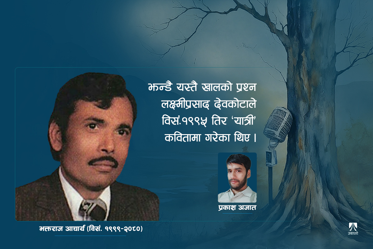 विसं १९९५ तिर झन्डै यस्तै खालको प्रश्न लक्ष्मीप्रसाद देवकोटाले यात्री कवितामा 'कुन मन्दिरमा जान्छौ यात्री?' भन्दै गरेका थिए। धर्मका नाममा चलेका कर्मकाण्ड र तीर्थव्रतिप्रति यो भजन पनि गम्भीर प्रश्न हो। मान्छेहरू धर्मका नाममा सिर्जित अनेक देवालय र तीर्थहरू धाउँछन्, जबकि यो सारा जगत् नै परमेश्वर भगवान् वा ईश्वरबाट भएको तर्क उनीहरू गर्छन्। जब यो जगत् नै परमेश्वरबाट निर्मित हो र कण–कणमा यदि ईश्वर छन् भने ईश्वरबाटै निर्मित मान्छे खास कुनै देवालय या प्रार्थनास्थल धाउनुको अर्थ के? घचेटाघचेट गर्दै, लाइनमा झगडा गर्दै प्रमुख मूर्ति/'अमूर्ति' हेर्ने या छुने के प्रयोजन?