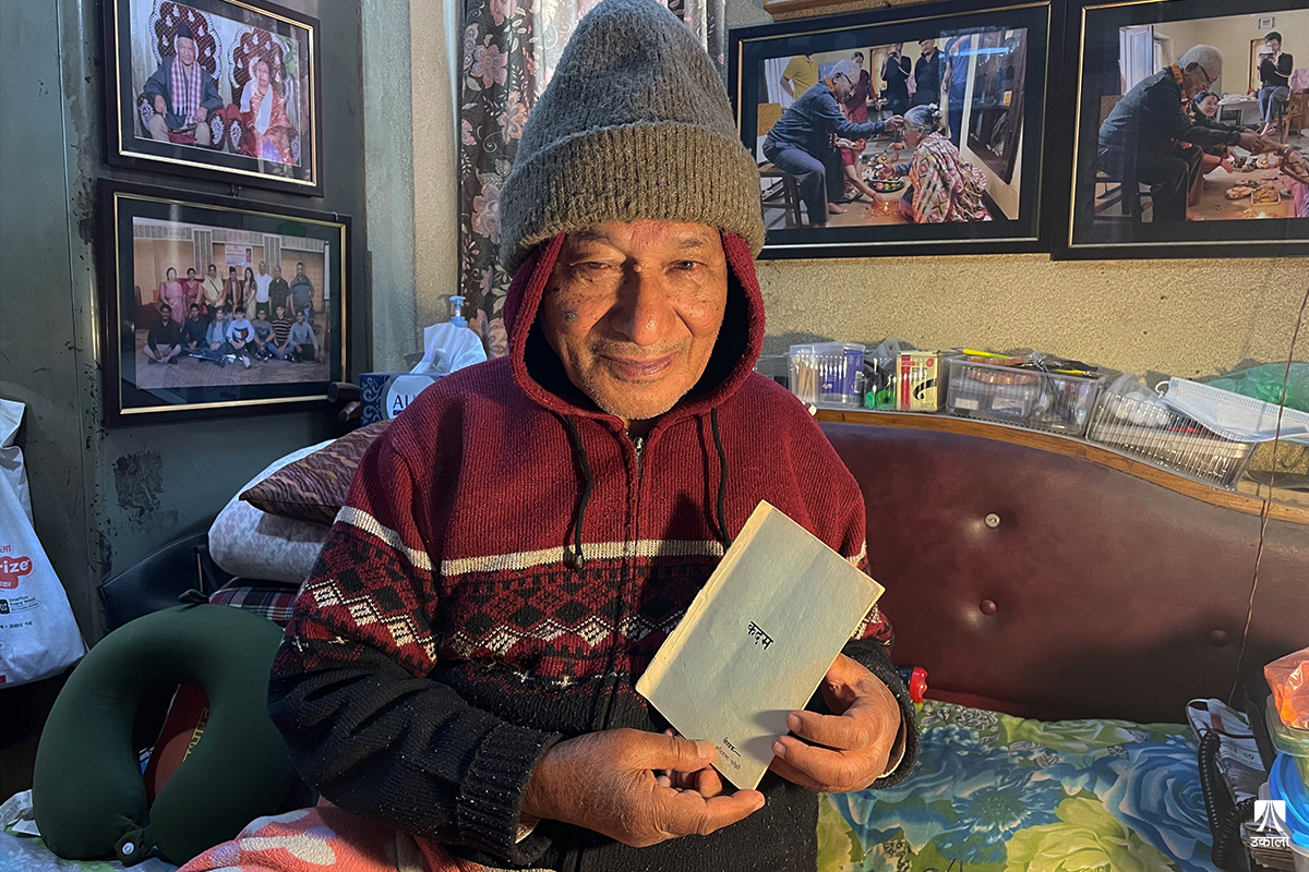 काखअघि खाटमाथिको ‘फोल्डिङ स्टडी टेबल’को कापीमा कलमले अक्षर कुदेर उनी कविता फुराउने गर्छन्। ती कवितामा तीन अक्षरको एउटा शब्दले स्थान पाइरहेको हुन्छ, ‘कदम’। हामी यसपटक पुग्दा भर्खरै एउटा कविता सकेर आफ्नो नातिलाई प्रिन्ट गर्न लगाएर ल्याएका थिए। कविताको एक अंश यस्तो थियोः
