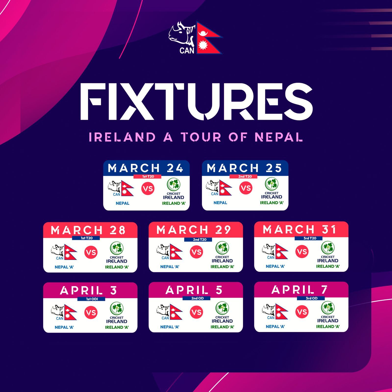 नेपाल ‘ए’ले टी२० शृंखलाअन्तर्गत पहिलो खेल चैत ११ गते आयरल्यान्ड ‘ए’सँग खेल्ने छ। त्यसपछि चैत १२, १५, १६ र १८ गते खेल्ने छ।
