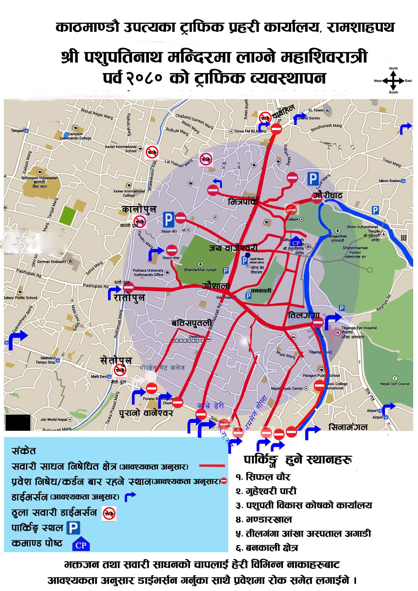 ट्राफिक प्रहरीले शिवरात्रिका दिन पशुपति क्षेत्रमा हुँदै चल्ने सवारीलाई डाइभर्सन गर्ने भएको छ भने मालवाहक सवारीलाई प्रवेश गर्न नदिने भएको छ।