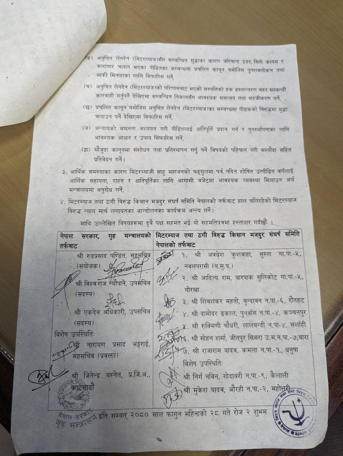 सरकार र मिटरब्याज तथा ठगीविरुद्ध किसान–मजदुर संघर्ष समितिबीच चारबुँदे सहमति भएको छ।