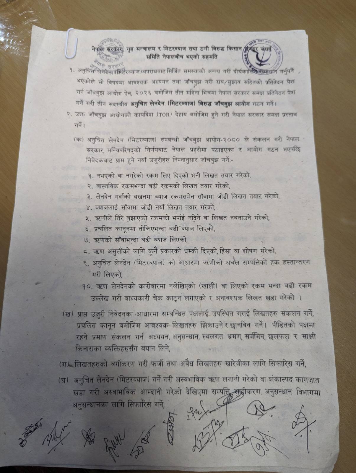 “अनुचित लेनदेन (मिटरब्याज) अपराधबाट सिर्जित समस्याको अन्त्य गरी दीर्घकालीन समाधान गर्नुपर्ने भएकोले सो विषयमा आवश्यक अध्ययन तथा जाँचबुझ गरी राय/सुझावसहितको प्रतिवेदन पेश गर्न जाँचबुझ आयोग ऐन, २०२६ बमोजिम तीन महिनाभित्रमा नेपाल सरकारसमक्ष प्रतिवेदन पेश गर्ने गरी तीन सदस्यीय अनुचित लेनदेन (मिटरब्याज)विरुद्ध जाँचबुझ आयोग गठन गर्ने,” सहमति–पत्रको पहिलो बुँदामा भनिएको छ।