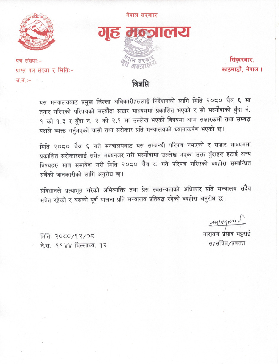 चैत्र ६ गते मन्त्रालयबाट यससम्बन्धी परिपत्र नभएको पनि विज्ञप्तिमा उल्लेख गर्दै अगाडि भनिएको छ, “सञ्चारमाध्यममा प्रकाशित सरोकारलाई समेत मध्यनजर गरी मस्यौदामा उल्लेख भएका उक्त बुँदाहरू हटाई अन्य विषयहरू मात्र समावेश गरी चैत्र ८ गते परिपत्र गरिएको छ।”