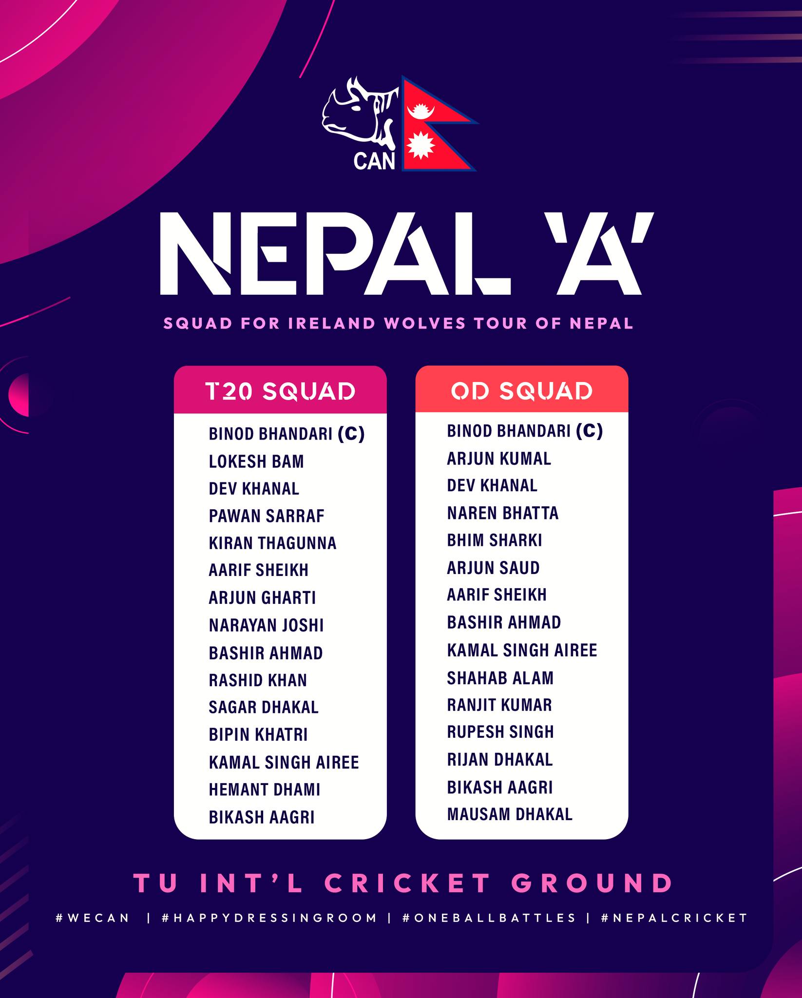 क्यानले आइतबार विनोद भण्डारीको कप्तानीमा दुवै ‘फर्म्याट’को नेपाल ‘ए’टिम घोषणा गरेको हो।