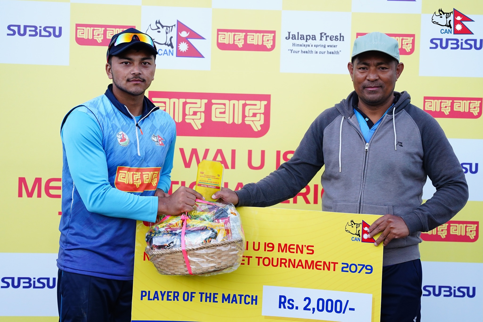 यता, ओमकार यादवले २ विकेट लिए। अभिशेक कोइराला, अर्थब पौड्याल र अहमद राजाको नाममा १/१ विकेट रह्यो।