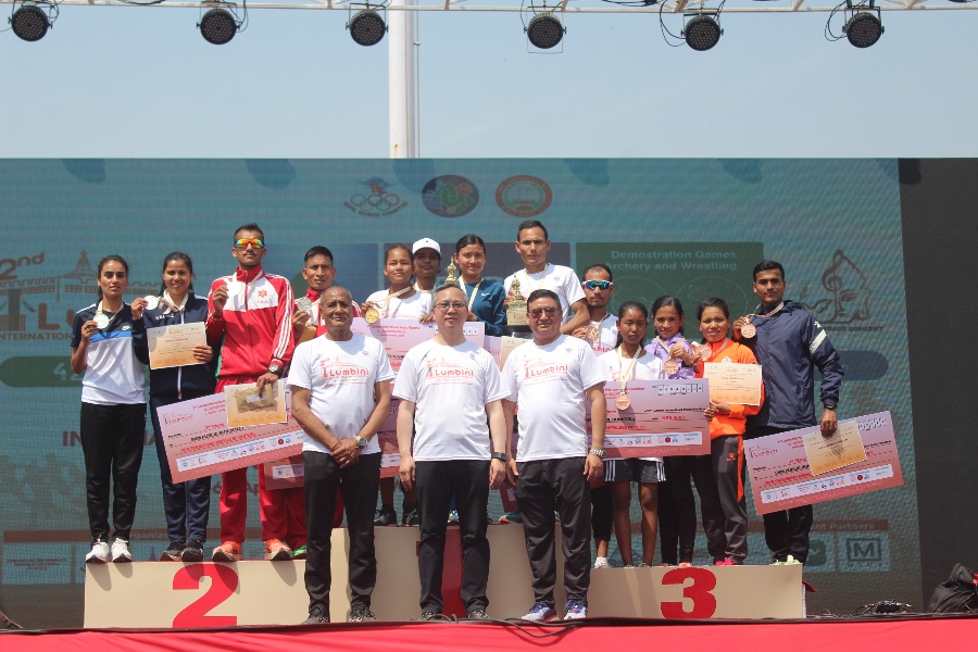 रुपन्देही– गौतमबुद्धको जन्मस्थल लुम्बिनीमा सम्पन्न भएको अन्तर्राष्ट्रिय पिस म्याराथनको सबै पुरस्कार नेपाली धावकले जितेका छन्। नेपाल, चीन, पाकिस्तान र श्रीलंकाका धावकहरू सहभागी म्याराथनमा पुरुषतर्फको म्याराथनको उपाधि बागलुङका तीर्थ पुनले जितेका छन्। पुनले निर्धारित ४२.१९५ किलोमिटरको दूरी दुई घण्टा २० मिनेट ४९ सेकेन्डमा पार गर्दै स्वर्ण पदकसँगै नगद पाँच लाख रुपैयाँ प्राप्त गरे।