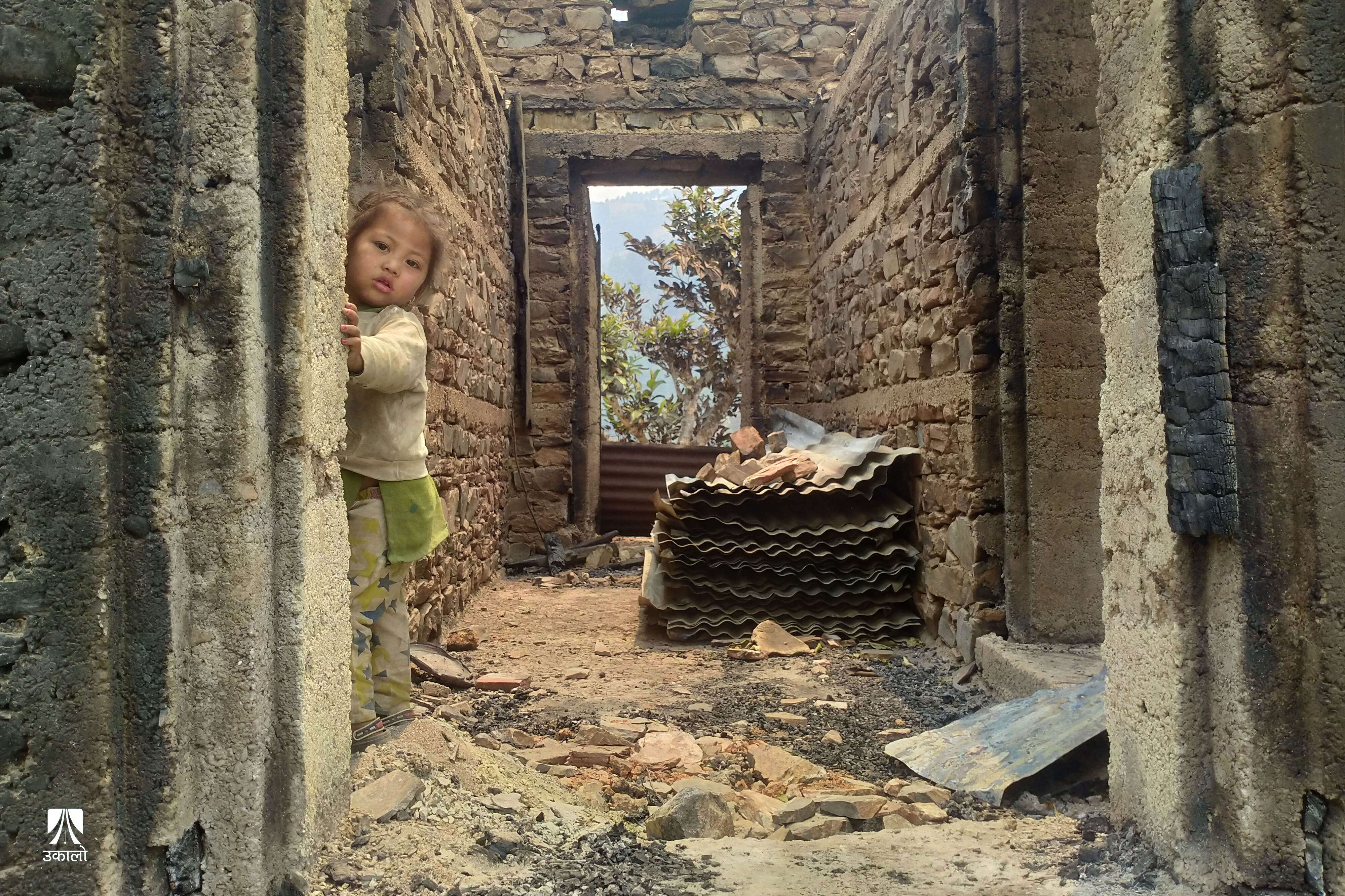 वैशाख १८ गते बस्ती पसेको डढेलोले गाउँ नै खरानी बनाएको थियो। त्यही खरानीमाथि सुत्नु परेको पीडितहरूको दुखेसो थियो। पहिला घर भएको ठाउँमा खरानी, जलेको काठका अँगार र जस्तापाताका टुक्रा मात्र थिए। आगोमा पर्नबाट बचेका केही कुखुरी खानेकुराका लागि भुईं खोस्रिँदै थिए।