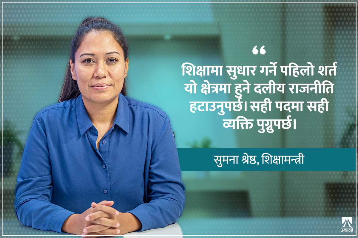संसद् बैठक र संसदीय समितिमा विभिन्न विषयलाई प्रभावकारी ढंगमा उठाउने सांसदको परिचय बनाएकी सुमना श्रेष्ठले शिक्षामन्त्रीको जिम्मेवारी सम्हालेको करिब चार महिना भयो। त्यसयता दलीय राजनीतिमा सक्रिय शिक्षकलाई कारबाही गरेको विषयले धेरै चर्चा पायो। उनकै सक्रियतामा उच्चस्तरीय राष्ट्रिय शिक्षा आयोगको प्रतिवेदन पाँच वर्षपछि सार्वजनिक भएको छ। उनले संसद्मा सांसदहरूको प्रश्नको जवाफ दिने क्रममा दलहरूको भ्रातृसंगठनका रूपमा खुलेका प्राध्यापक संगठनहरूको राजनीतिले विश्वविद्यालयका कामकारबाहीमै बाधा परेको समेत बताएकी थिइन्। मन्त्री श्रेष्ठसँग सरकारको शिक्षा नीति र शैक्षिक क्षेत्रका समस्याबारे उकालोका लागि लोकेन्द्र विश्वकर्माले लिएको अन्तर्वार्ताः