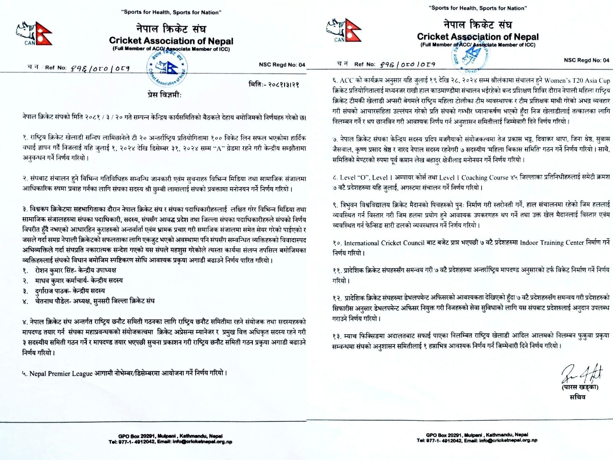 संघले छुम्बी लामालाई प्रवक्ता तोकेको छ भने राष्ट्रिय छनोट समिति गठनका लागि संयोजक तथा सदस्यको मापदण्ड तयार गर्न संघका महाप्रबन्धकको संयोजकत्वमा क्रिकेट अप्रेसन म्यानेजर र प्रमुख वित्त अधिकृत सदस्य रहने गरी तीन सदस्यीय समिति गठन गरेको छ। त्यस्तै क्यानले नेपाल प्रिमियर लिग आगामी नोभेम्बर/डिसेम्बरमा आयोजना गर्ने निर्णय गरेको छ। त्यस्तै, बैठकले स्पिनर सन्दीप लामिछानेलाई जुलाई १ देखि डिसेम्बर ३१ सम्म ‘ए’ ग्रेडमा रहने गरी केन्द्रीय सम्झौतामा अनुबन्धन गर्ने निर्णय गरेको छ।