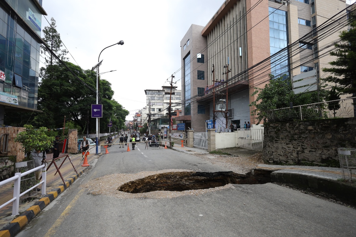 काठमाडौँ प्लाजादेखि उत्तरतर्फ दरबारमार्गस्थित महेन्द्र सालिकबाट कमलादीको कृष्ण पाउरोटी चोक निस्किने एकतर्फी सडक भासिएको हो। भ्वाङ परेको स्थानमा प्रहरीले घेरा हालेर राखेका छन्।