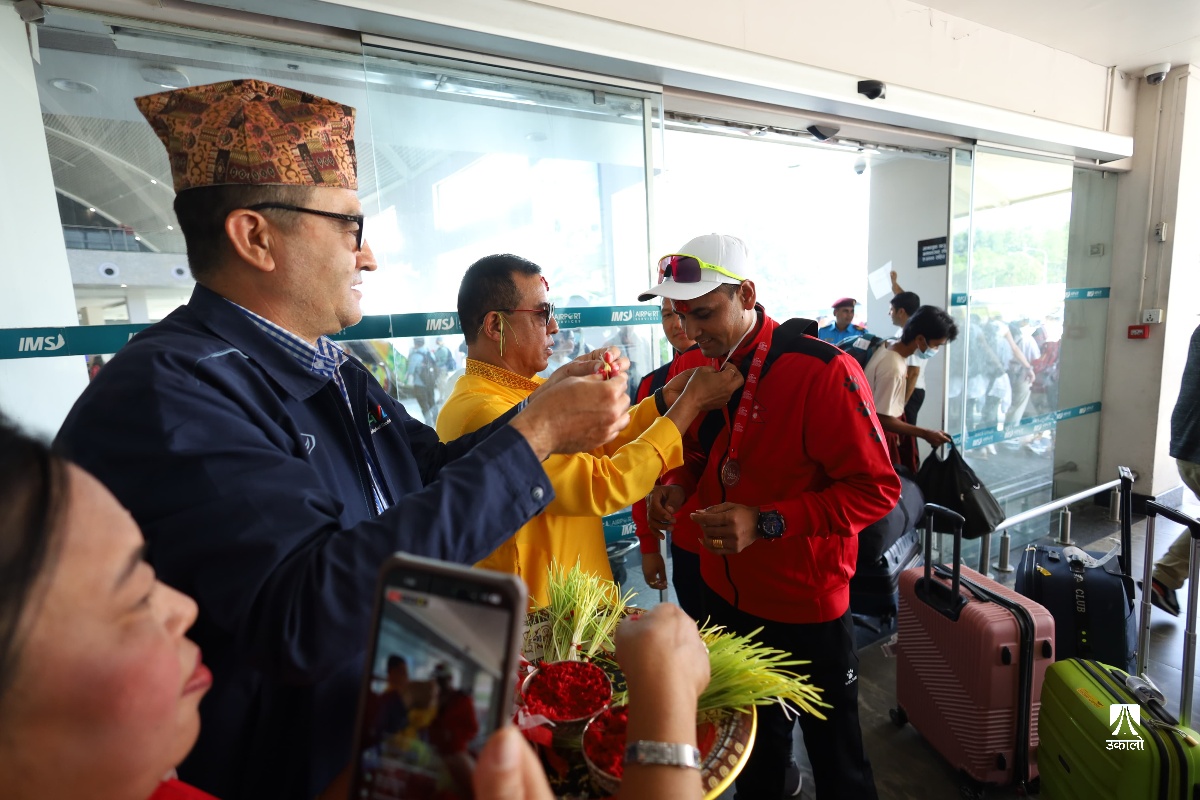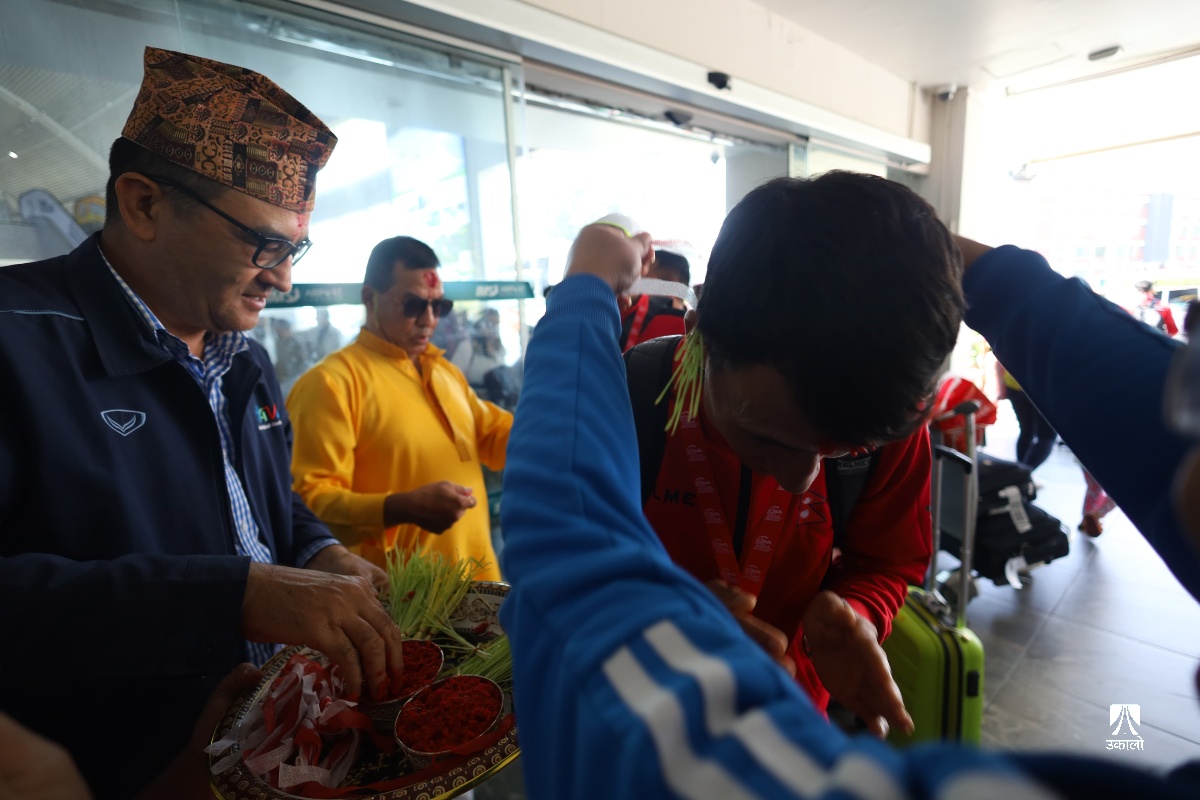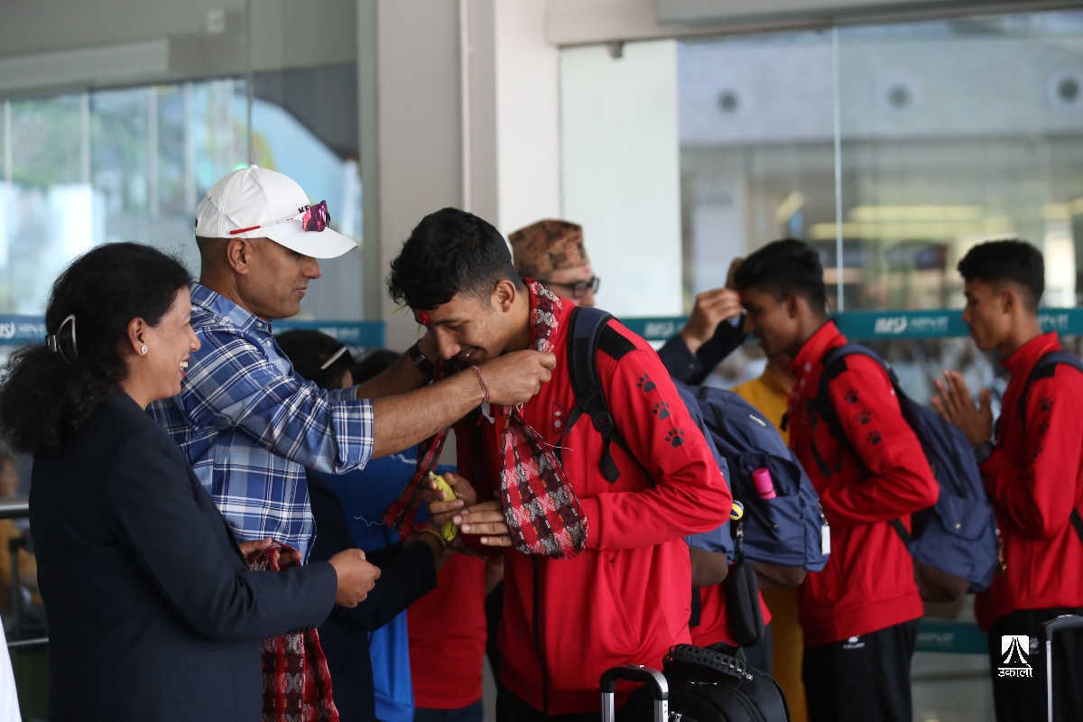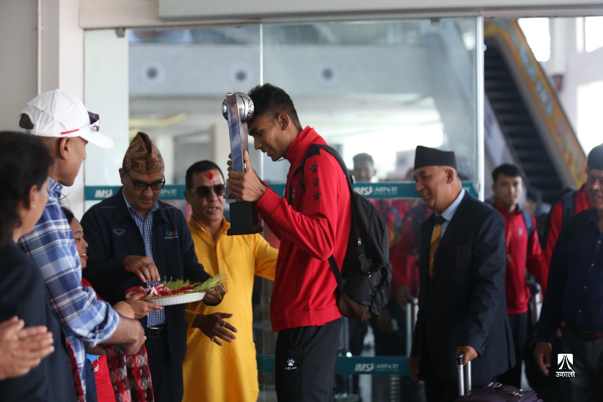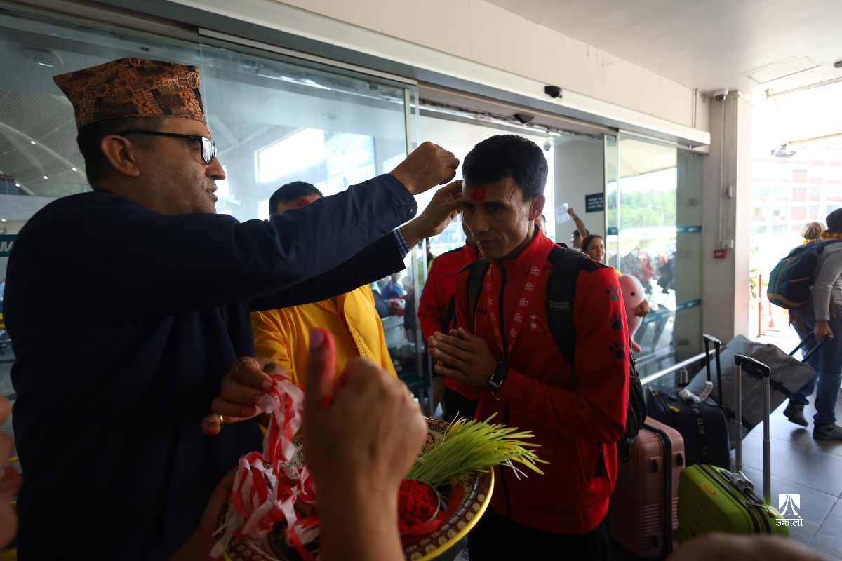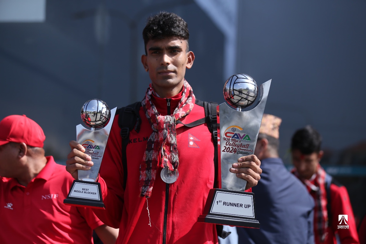 नेपाल भलिबल एसोसिएसनका पदाधिकारीले उपविजेता टोलीलाई खादासहित टीका–जमरा लगाएर विमानस्थलमा स्वागत गरेका छन्। शनिबार बेलुकी भएको फाइनलमा उज्बेकिस्तानसँग नेपाल ३–१ को सेटमा पराजित भएर उपविजेता बनेको हो।