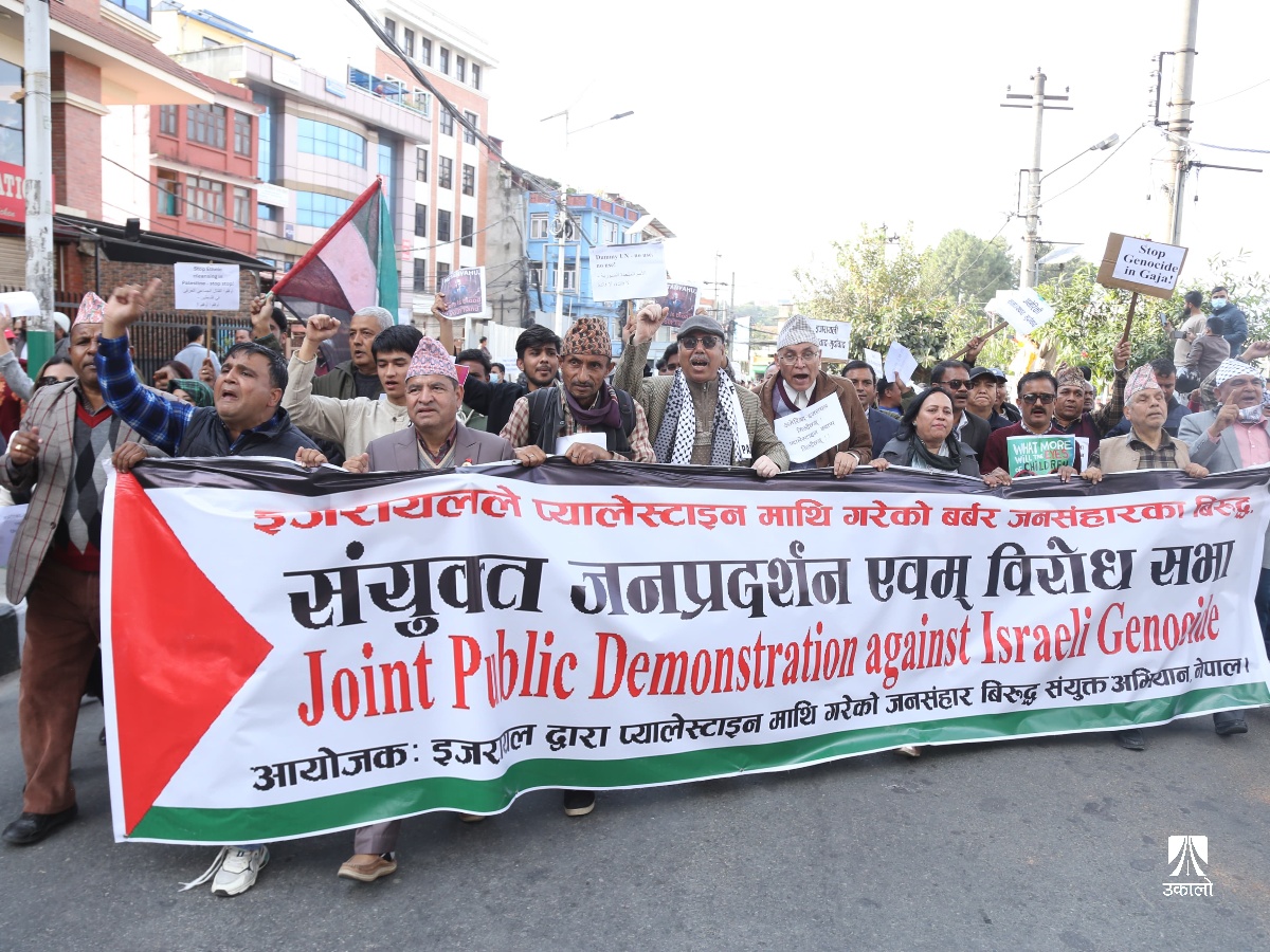 प्यालेस्टिइनमाथि इजरायलबाट भइरहेको आक्रमण रोक्न माग गर्दै नागरिक समाज, राजनीतिक पार्टीका भ्रातृ संगठन तथा अभियन्ताले संयुक्त रूपमा काठमाडौँमा जनप्रदर्शन गरेका छन्।