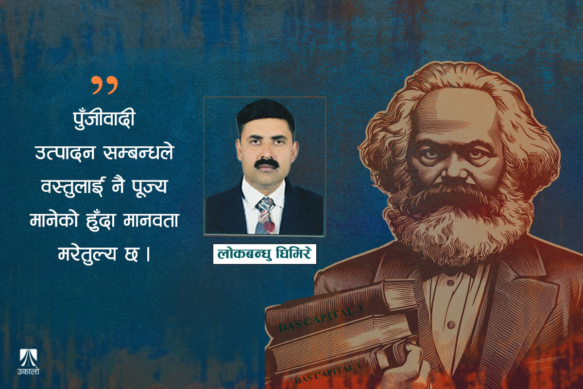 यस आलेखमा पनि समाजवाद र साम्यवादलाई त्यसरी नै लिइएको छ। तर यति बेला विद्यमान पुँजीवादी उत्पादन सम्बन्धले वस्तु (कमोडिटी–माल) लाई नै पूज्य वस्तु मानेको हुँदा मानवतालाई मरेतुल्य बनाएको छ। यहाँ वस्तु उत्पादन र पुँजीको सम्बन्ध यसरी विकसित हुन्छ कि मानव श्रम (भौतिक वा बौद्धिक) घनघोर शोषणको चपेटामा फस्न जान्छ, जसले पुँजीवादको समग्र सामाजिक–संरचनागत ढाँचा नै शोषणमा निर्भर रहनु पर्ने बनाइदिन्छ। फलस्वरूप, समाजमा बृहत्तर असमानता, अन्तर्विरोध र वर्गीय टकराब सिर्जना हुन्छ। समाजका करिब ९९ प्रतिशत मानिस शोषित हुन्छन्। उनीहरू कम आम्दानीसहित गरिबीको चक्रव्यूहमा फस्छन् र केही प्रतिशत मात्रै धनाढ्य हुन्छन् वा पुँजीपति हुन्छन्। तिनले नै राज्यको समग्र आयस्रोत तथा कार्य प्रणालीमा नियन्त्रण गर्दै आम श्रमिक वर्ग उपर निरन्तर शोषण गरिरहन्छन्। यो प्रणालीगत र संरचनागत ढाँचामा हुन्छ। यसैलाई पुँजीवादी उत्पादन प्रणालीको ढाँचा भनिन्छ।