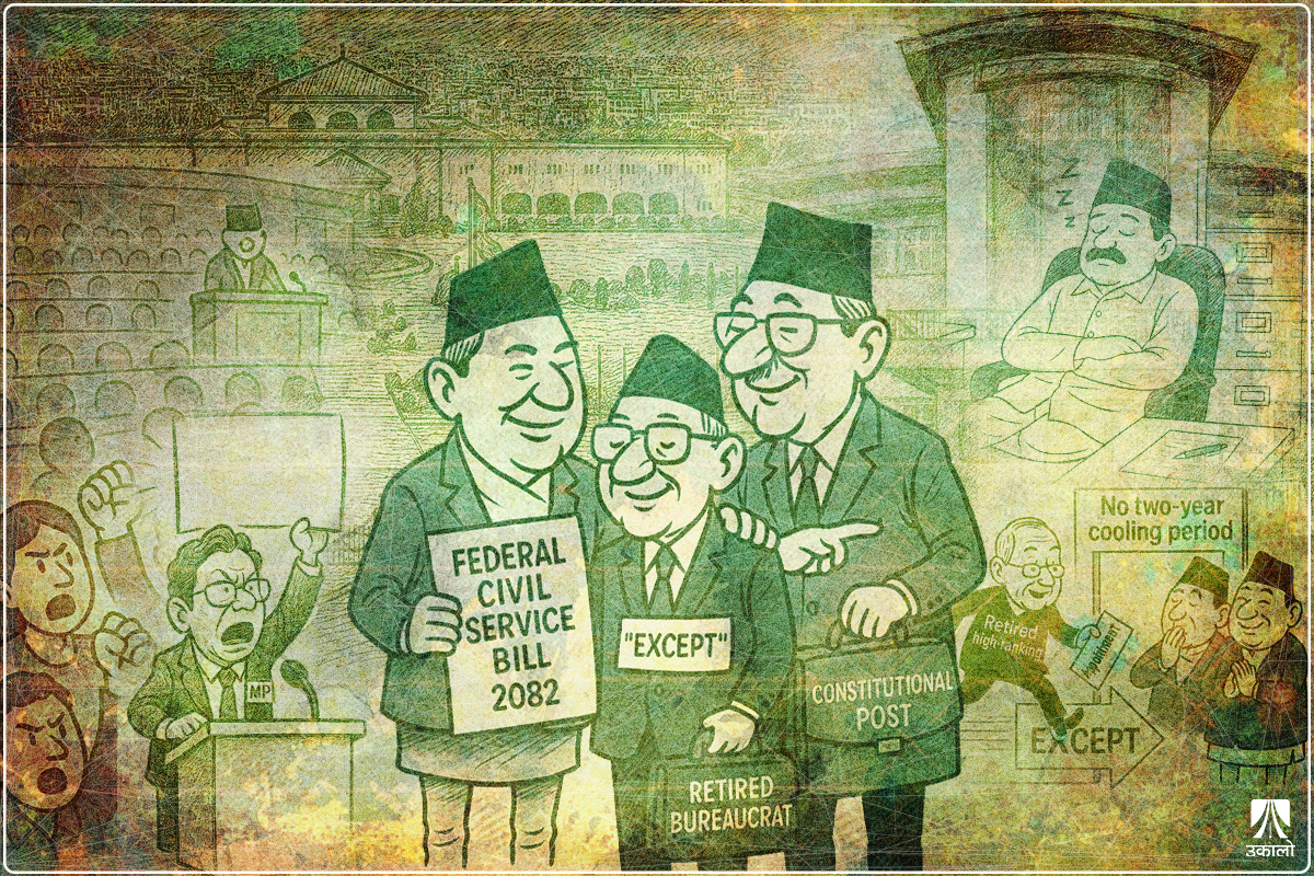 कर्मचारीले संसद्मा विचाराधीन अनि ‘कुलिङ अफ पिरियड’को कारण बहुचर्चित/विवादपूर्ण निजामती सेवा विधेयकमार्फत आफूलाई फाइदा पुग्ने समाधान खोजेका छन्। विधेयकमा सचिव र सहसचिवबीचमा अतिरिक्त सचिवको पद सिर्जना गरिएको छ। त्यतिमात्रै होइन, अतिरिक्त सचिवको पदावधि नै तोकिएको छैन। २४ (क) मा मुख्यसचिवको दुई वर्ष, सचिवको चार वर्ष पदावधि तोकिए पनि अतिरिक्त सचिव (विधेयकमा १३औँ तह भनिएको) मा तोकिएको छैन।